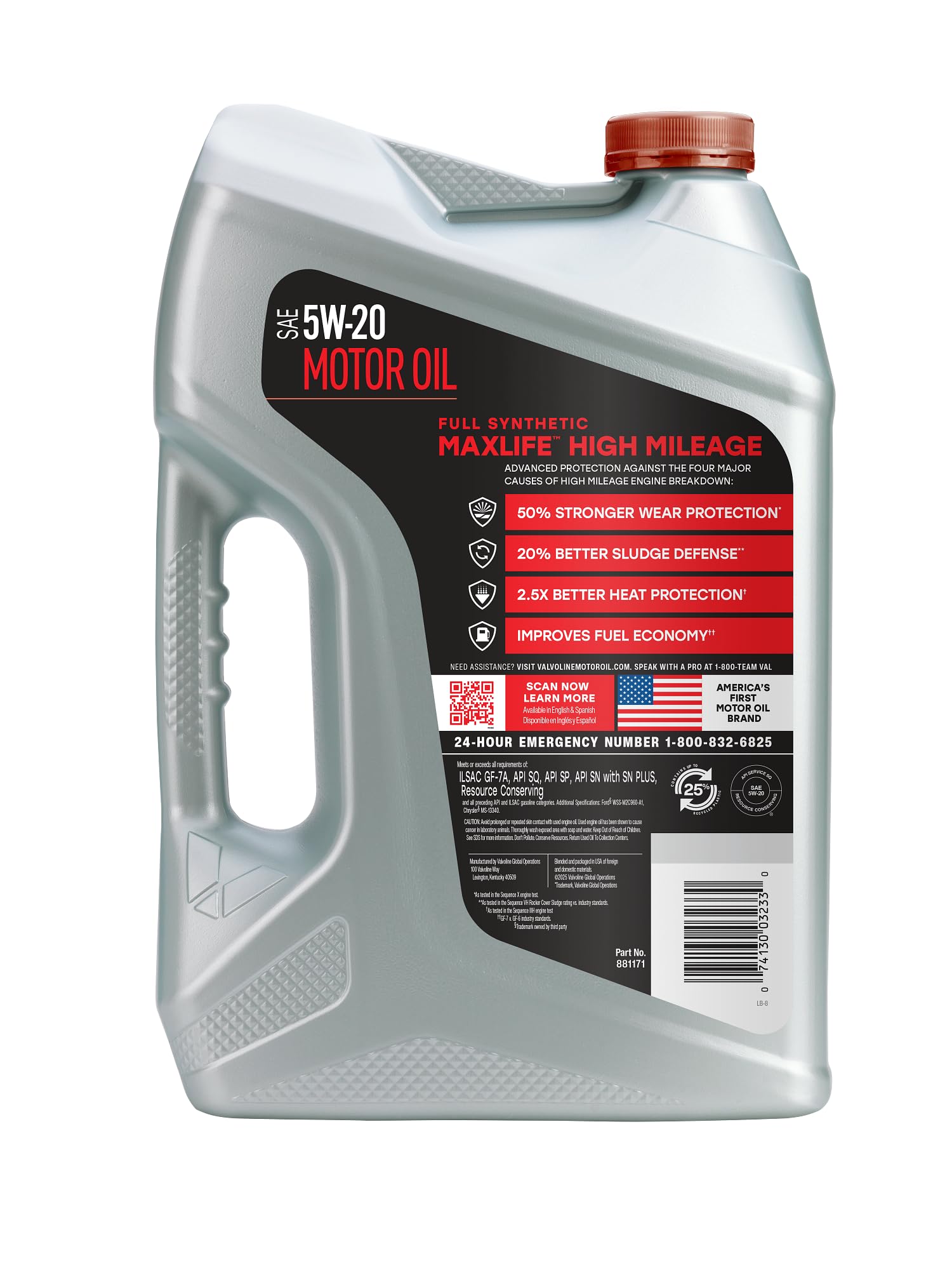 Sludge, a byproduct of oil oxidation, can thicken and build up in the engine causing increased friction, lower fuel efficiency and excessive heat. Older engines are also susceptible to oil consumption and oil leaks. To combat the effects of aging engines, choose Valvoline MaxLife Full Synthetic 5W-20 High Mileage Motor Oil. Specifically engineered for vehicles with over 75,000 miles, MaxLife Full Synthetic provides 50% better wear protection, 20% better sludge defense, and 2.5X better heat protection than industry standards. Its full synthetic formula includes oil additives and premium seal conditioners to treat and prevent leaks, minimize oil consumption and improve fuel economy. Whether it’s a Dodge, Ford, Mazda, Jeep, Toyota or another make, including hybrid vehicles, Valvoline’s full synthetic formula provides advanced protection against the four major causes of engine breakdown: wear, friction, heat and deposits. For better performance and protection, upgrade from a conventional or synthetic blend oil to Valvoline MaxLife Full Synthetic High Mileage Motor Oil, proven to maximize engine life in vehicles with over 75,000 miles.