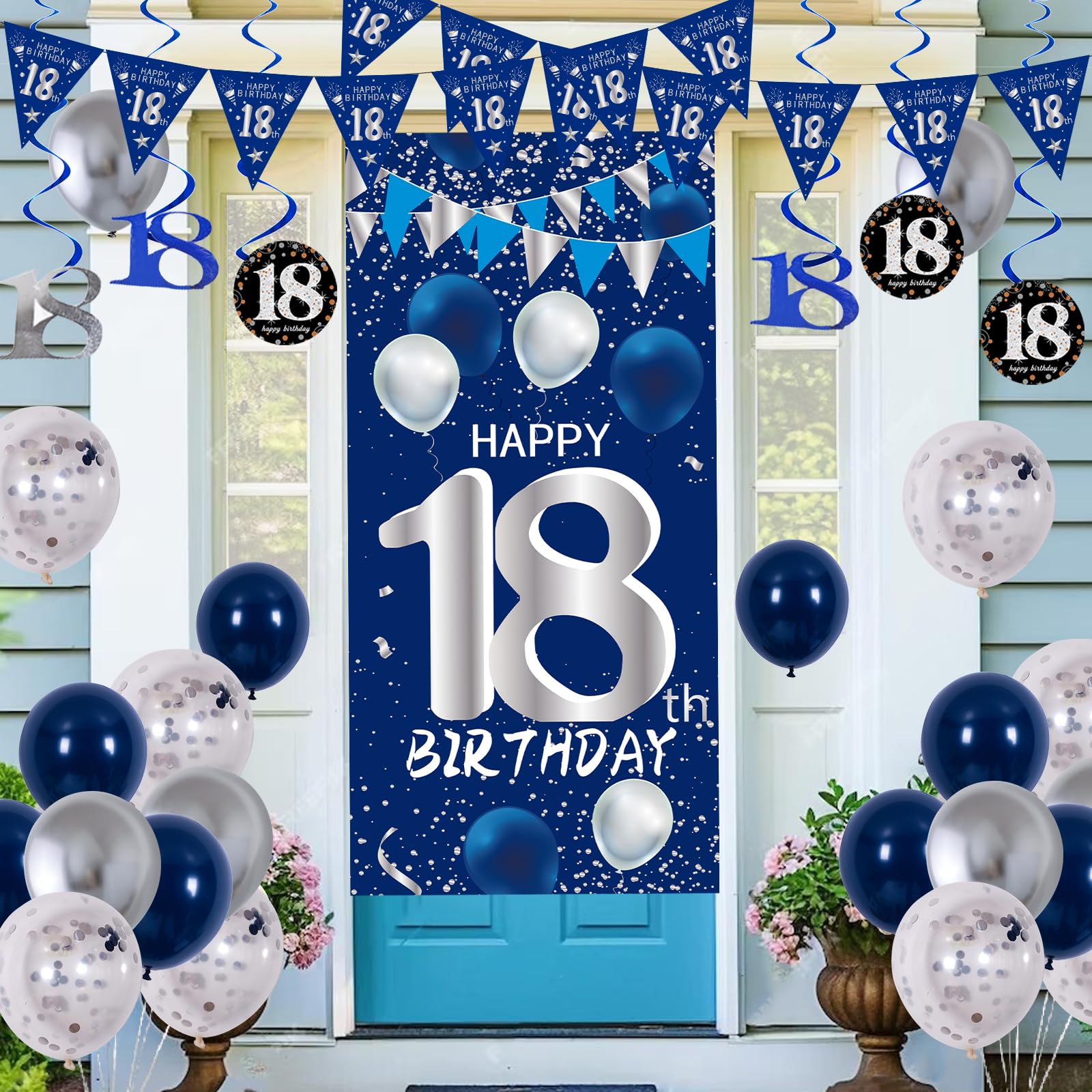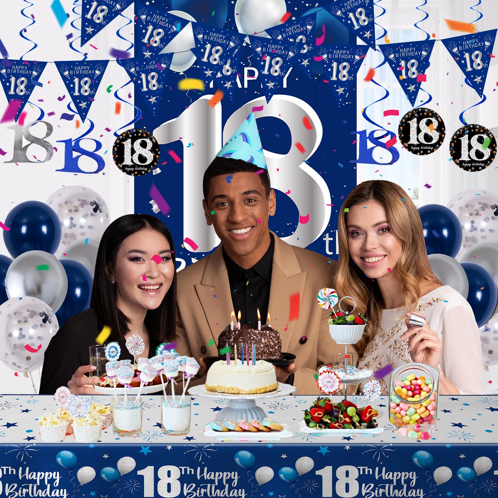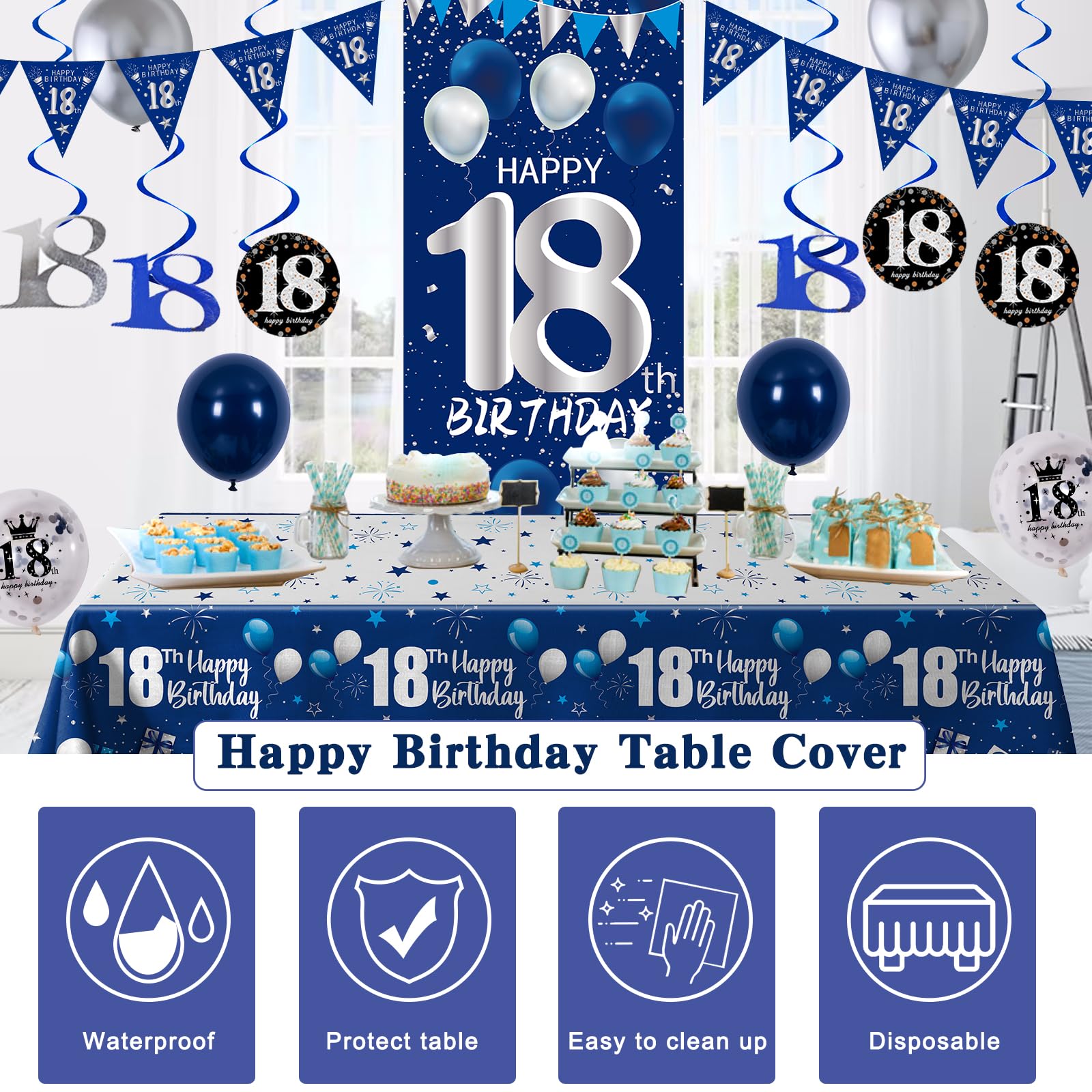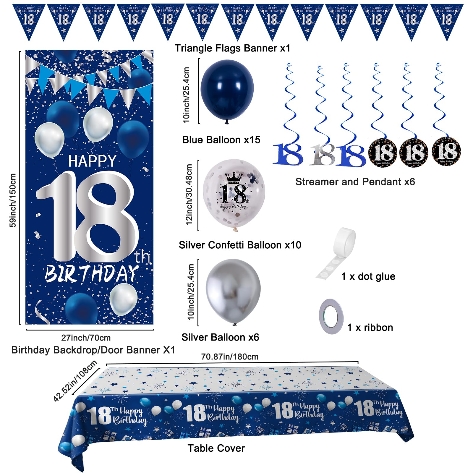 🎉【18th Birthday Decorations Kit for Men Boys】This blue and silver happy 18th birthday decorations party supplies are designed for 18 year old men boys and girls birthdays; Package list: 15x navy blue latex balloons, 10x silver confetti balloons, 6x silver latex balloons, 6x blue hanging swirls with number 18 pendant, 1x blue silver happy 18th birthday door banner, 1x blue silver 18th birthday tablecloth, 1 set x 18th triangle flag banner, 1x dot sticker, 1x ribbon.