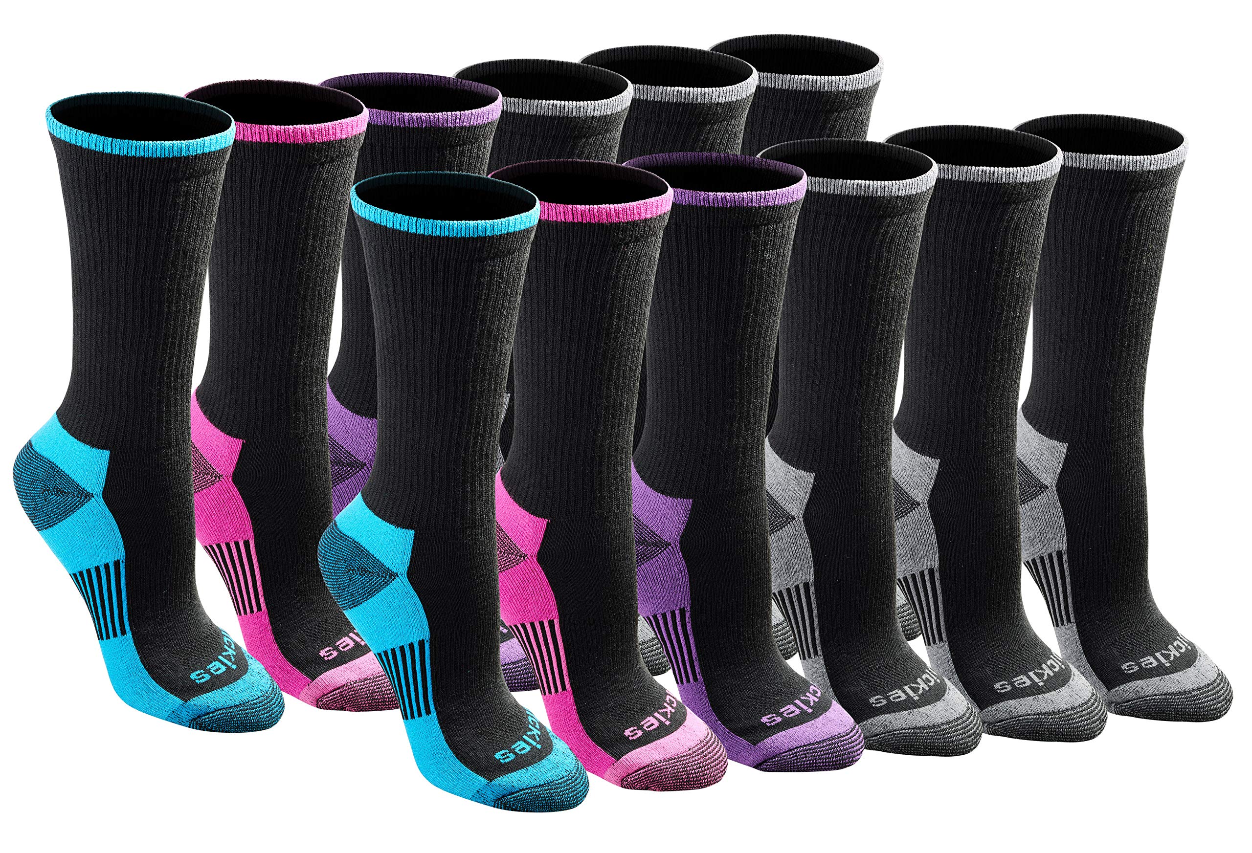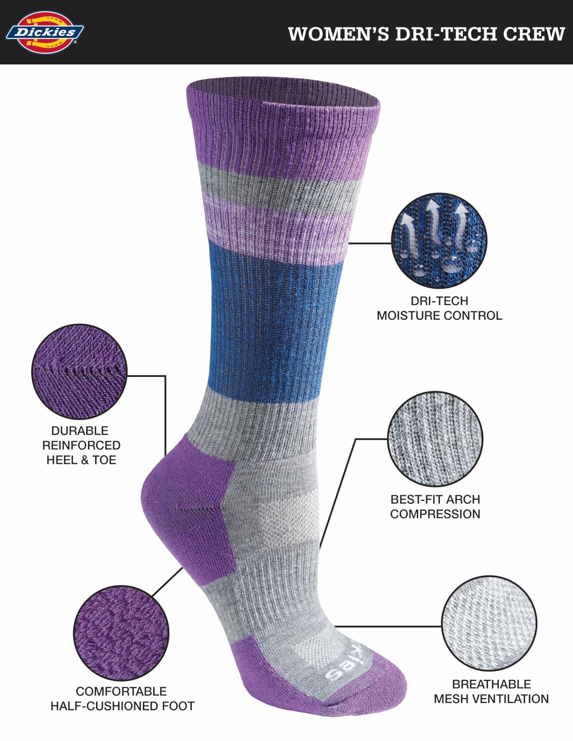 Description Dickies dri-tech moisture control for women's crew socks combines moisture wicking fibers and mesh ventilation channels to keep feet dry and comfortable. Since 1922 Dickies has been making hard-duty work products built to stand up to whatever life throws at you. Dickies Work Socks are built with purpose to deliver superior comfort and performance on and off the job. Dri-tech Moisture Control Sock Collection features: Moisture Management to help keep your feet cool, dry, and comfortable throughout the day.