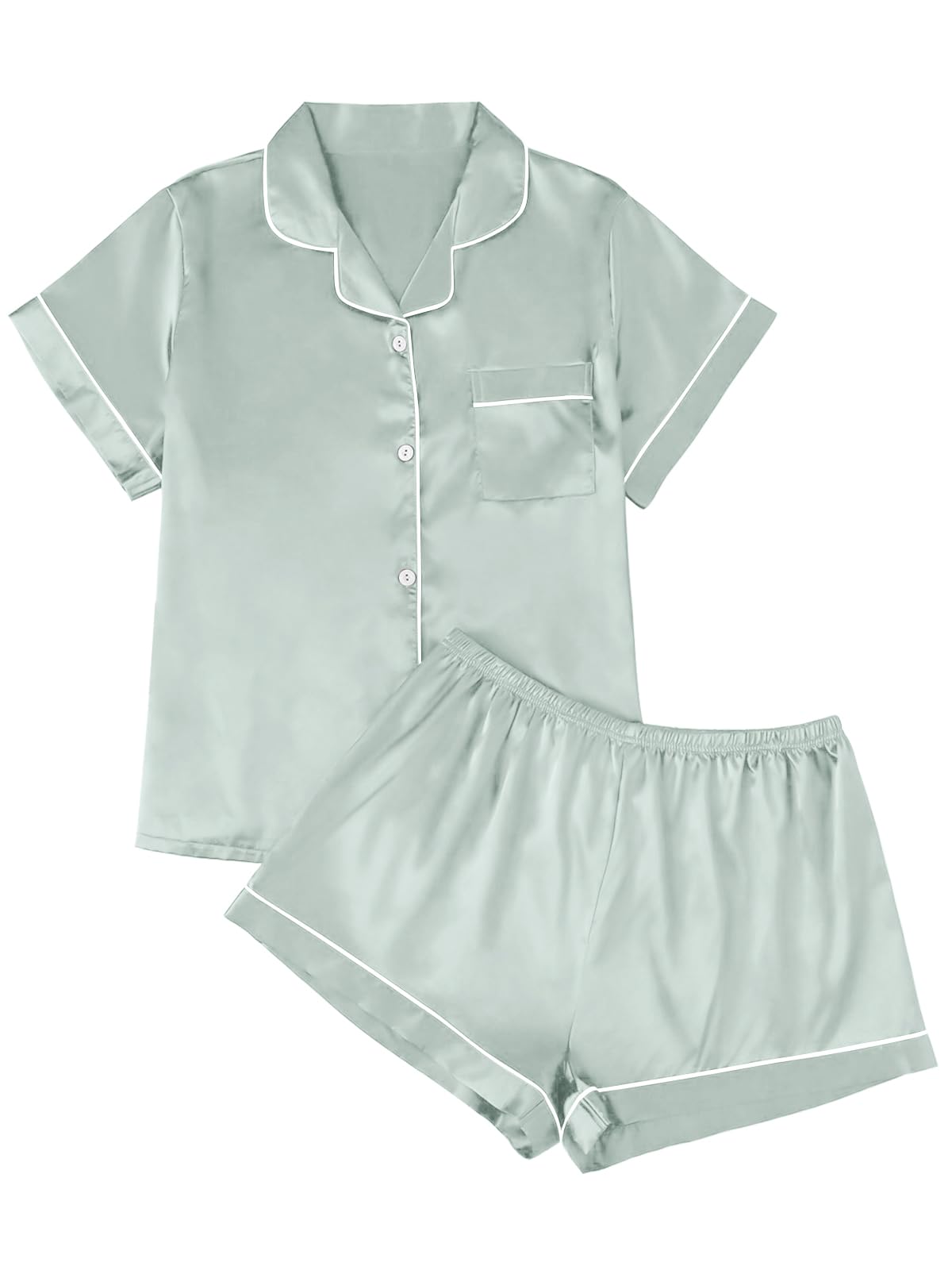 Features: The relaxed fit two-piece comfortable sleepwear pajama set features silky shorts with elastic waistband and matches a silky-smooth short-sleeve V-neck top with a chest pocket, notch collar and the button-front top hits at hips. The sleepwear set are soft and elegant, to giving you a lazy sleep