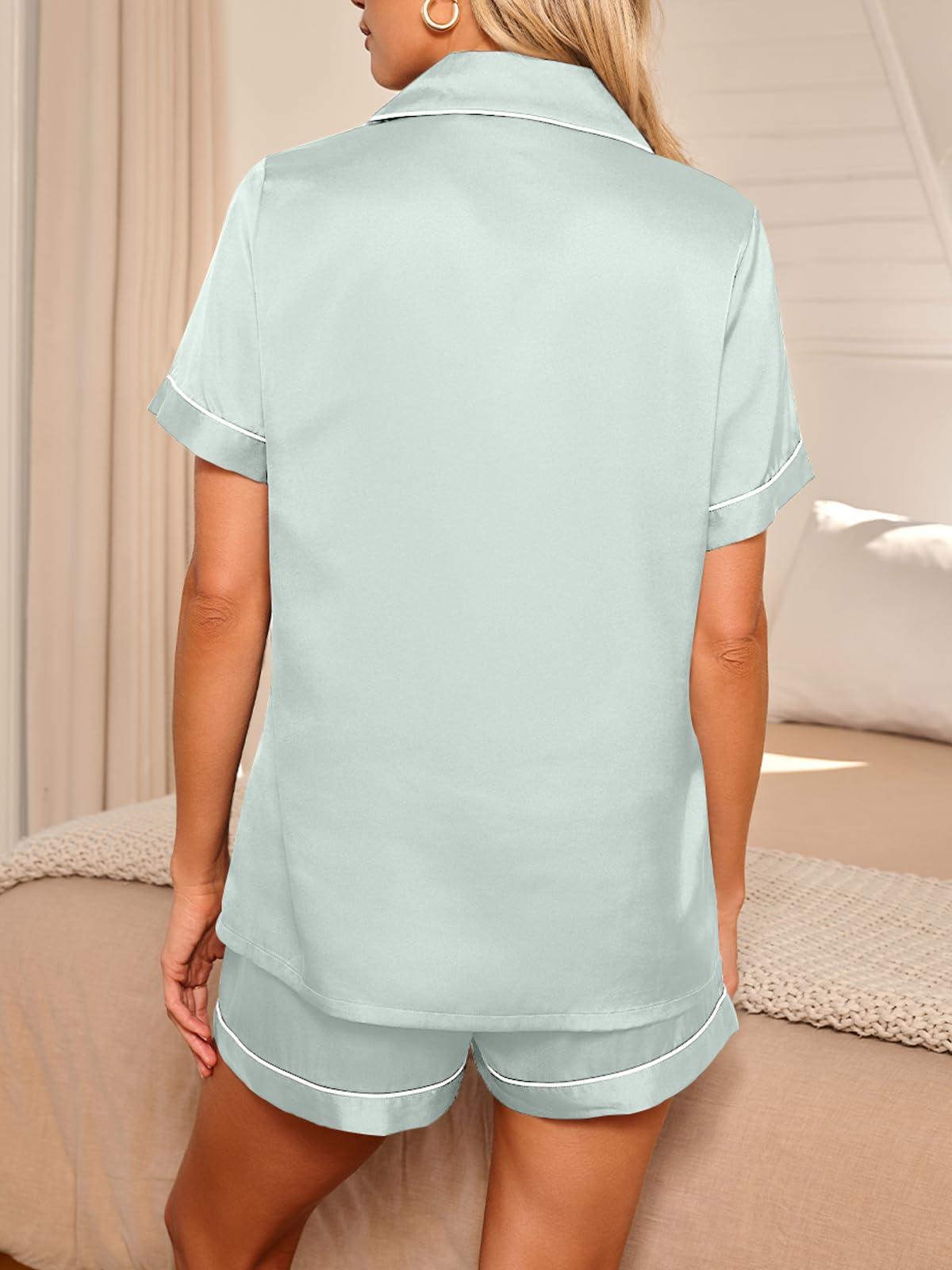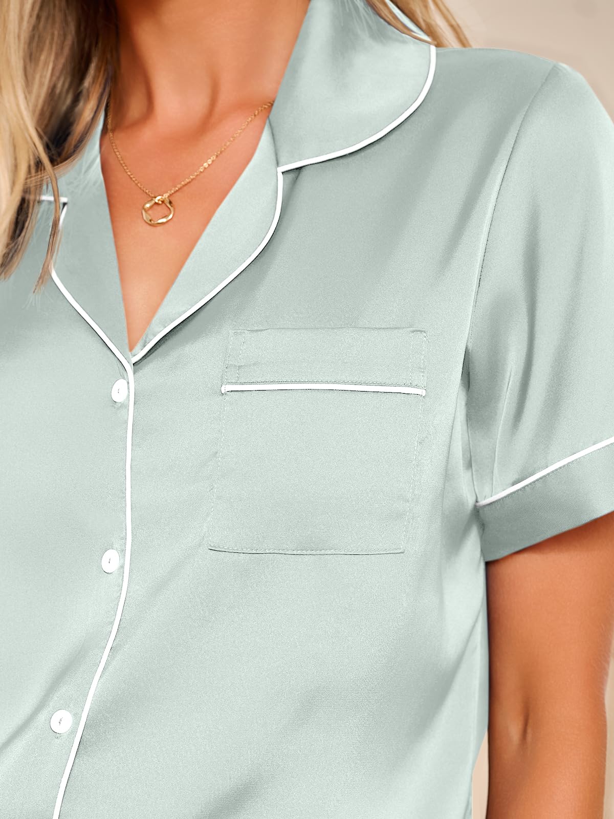 Pajama Top: Short sleeve sleepwear with notch collar,button front pajamas shirt and one chest pocket design.Lightweight and Skin-friendly silk pajamas for women.Great for sleeping,casual wear or lounging around the house or yard all day