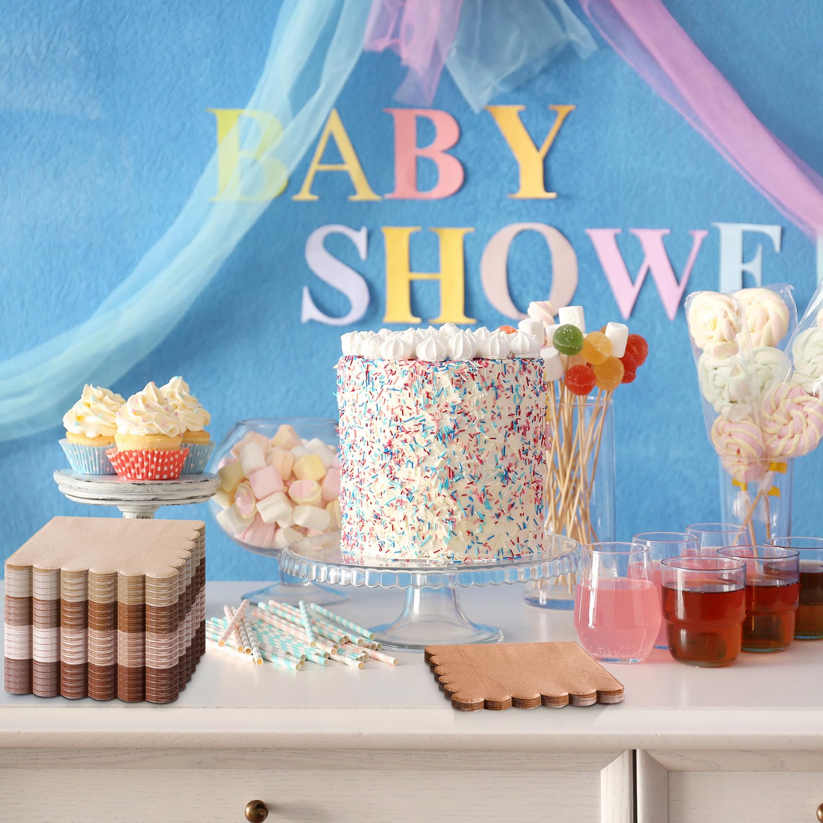Suitable for Versatile Occasions: be it holidays, baby shower, bridal shower, or a simple dinner party, our boho napkins are a suitable fit; Their classic earth tone color and scalloped edge design make them a hit at any celebration or occasion; These baby and bridal shower napkins are not just ideal for dining, but also excellent for table decorations, showcasing a versatile advantage