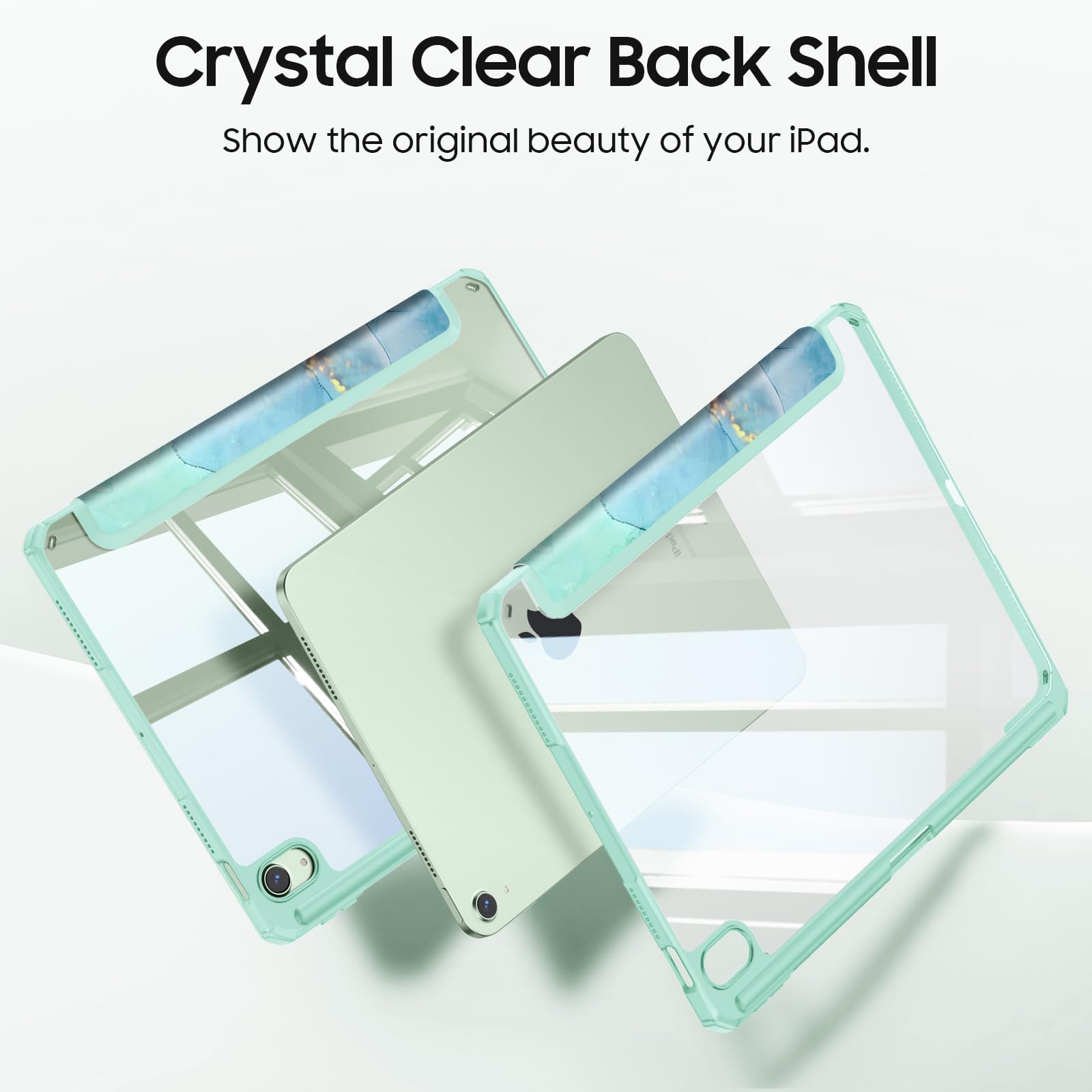 Hardshell back cover with flexible TPU bumper protects your iPad from shocks, drops and impacts. Soft microfiber interior front prevents your tablet from scratched. The crystal-clear transparent back cover proudly shows off the Apple icon and allows you to customize your case by adding stickers or showcasing photos.