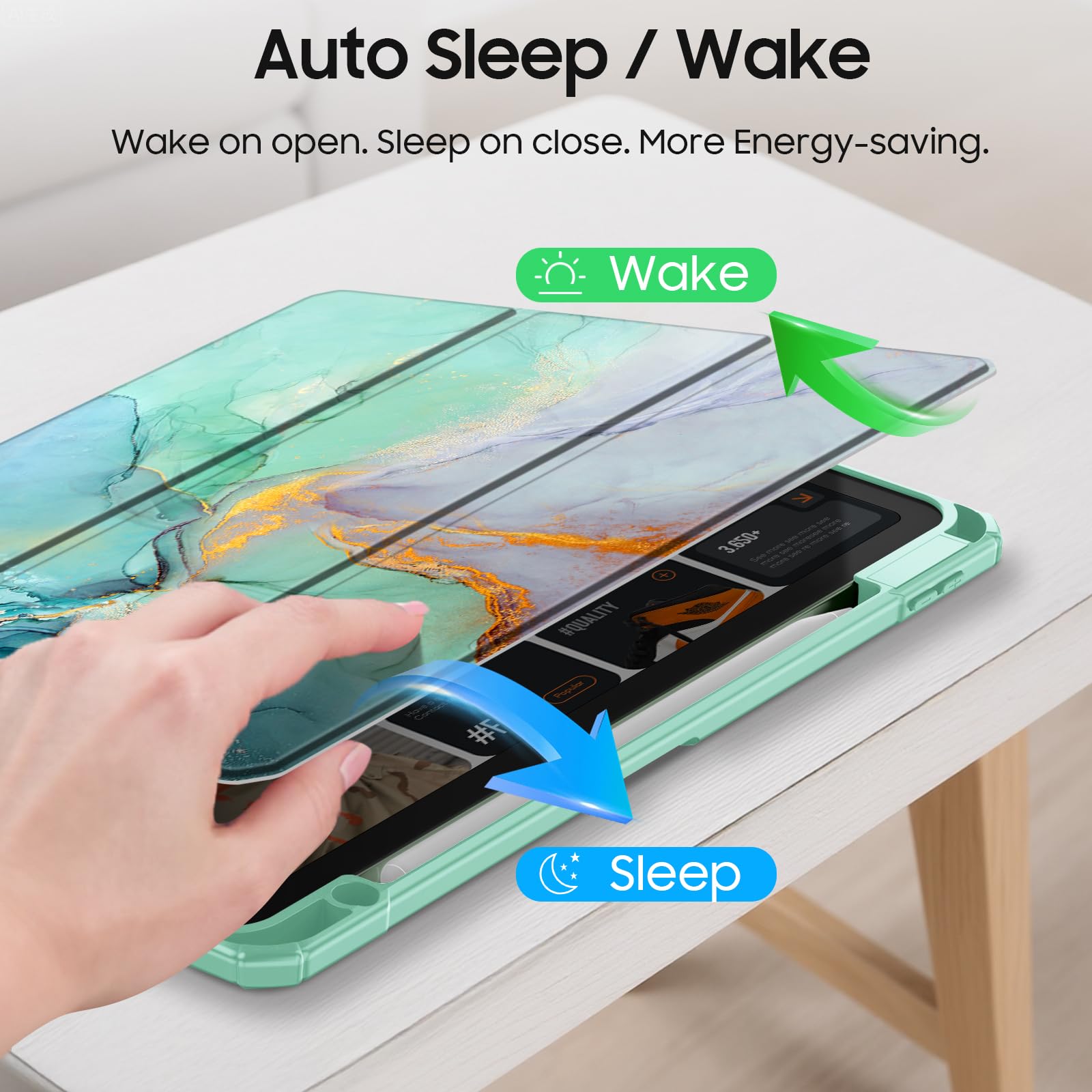 Easy clip-on application. With built-in magnets, automatically wakes or puts your device to sleep when the lid is opened and closed.