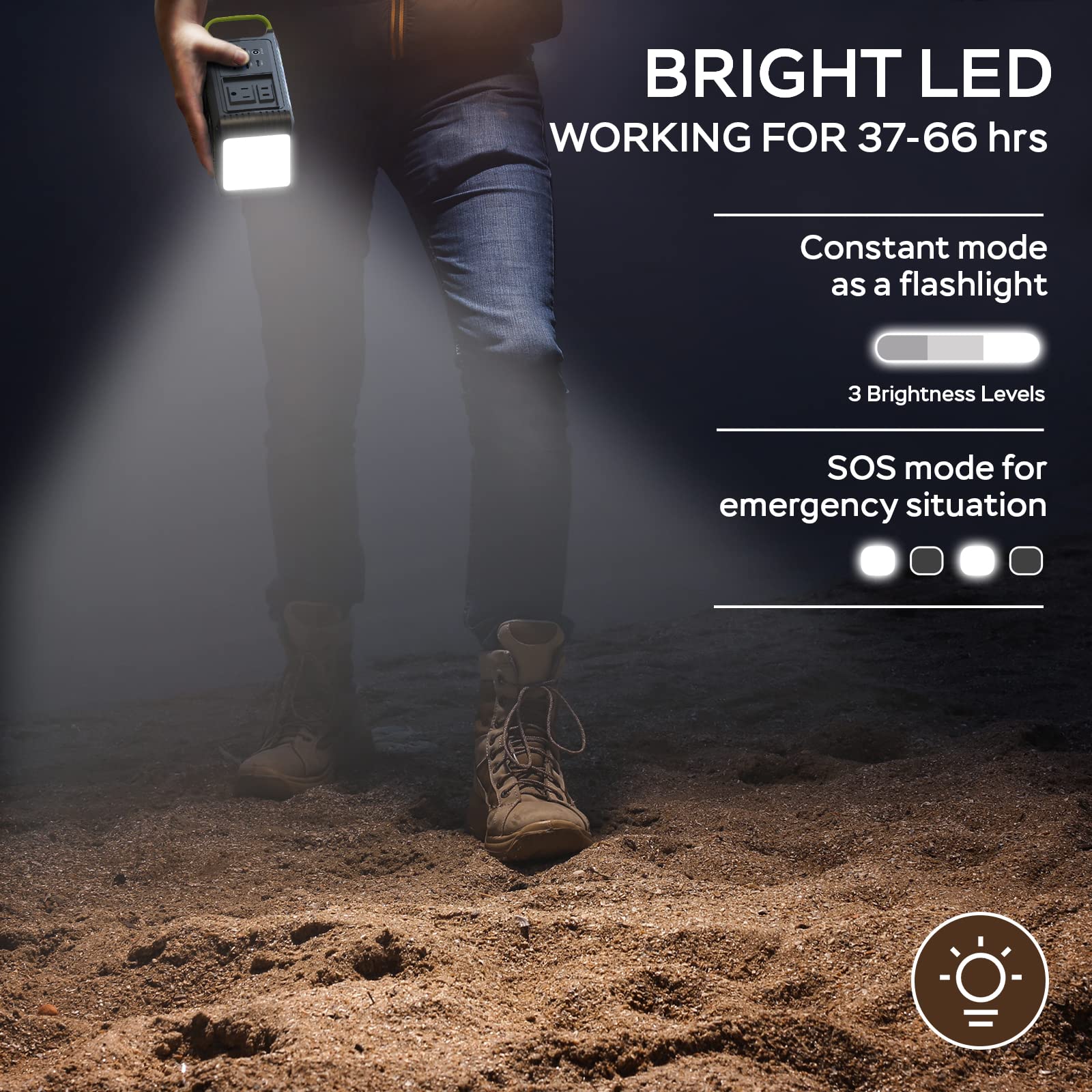 BRIGHT LIGHTS: With three levels of brightness, the portable power bank can be used as a professional flashlight when needed, which is very suitable for use when the car breaks down, power outage at home, or a tent power supply. The 1st level can be used for 68hrs(light up a small room), the 2nd level can be used for 48hrs(lighting for walking at night), and the 3rd level can be used for 37hrs(light up the living room). There is SOS mode, use the international SOS frequency for help.
