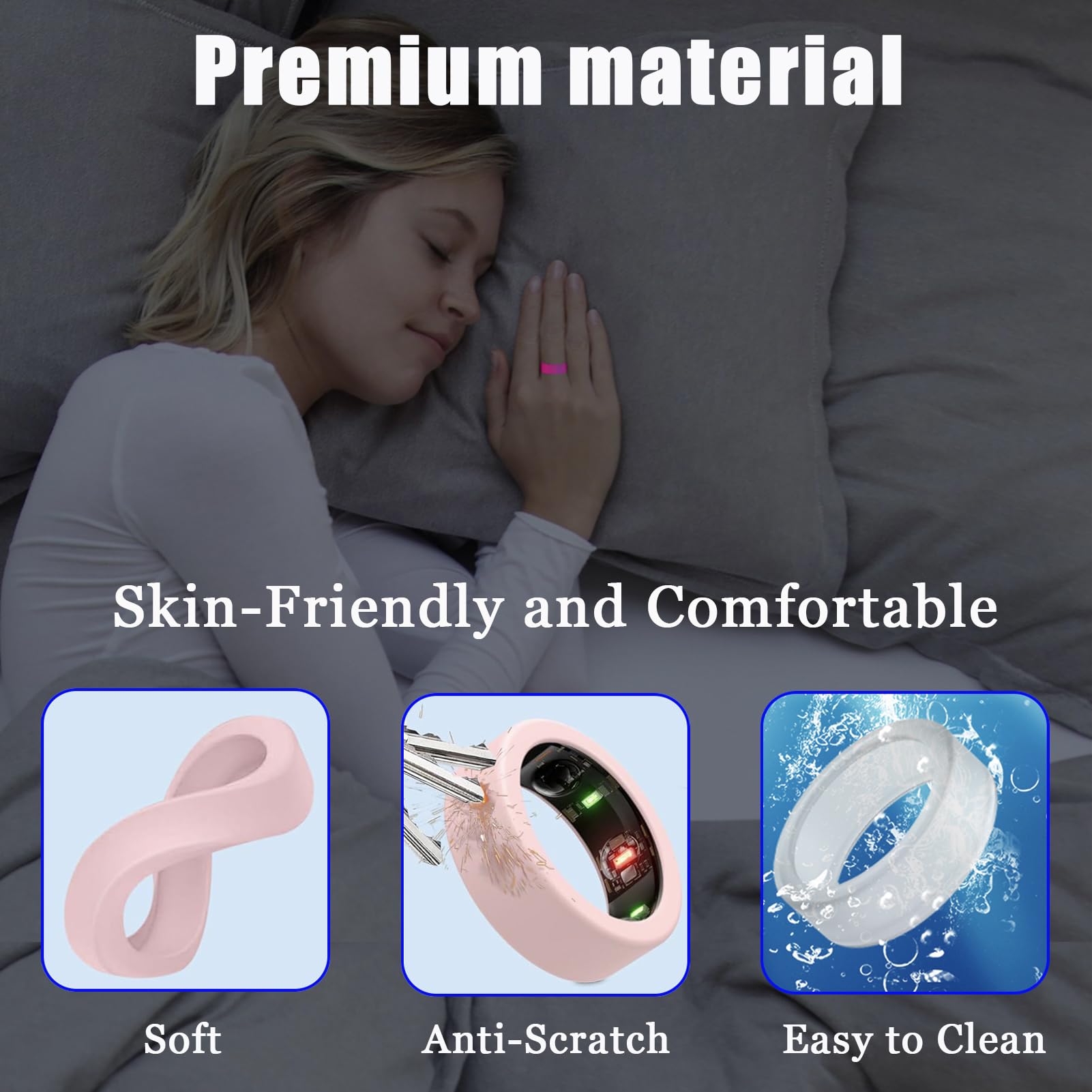 Minimalist Design: The ring sleeve is slim and strechy, washable and sturdy , easy to slide on the smart ring, stays firmly in place, and effectively shields smart ring from harm