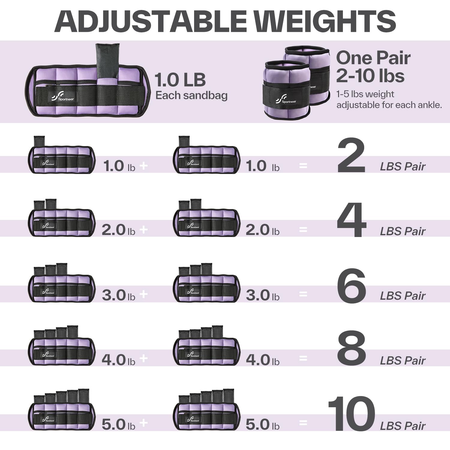 ADJUSTABLE LEG WEIGHTS: The sandbags for ankle weights are removable. Each single weight comes with 5 removable sandbags which weighs 1 LB. Each single weight can be adjusted from 1 to 5 lbs and one pair weights can be adjusted from 2 to 10 lbs by adding or reducing the sandbags.