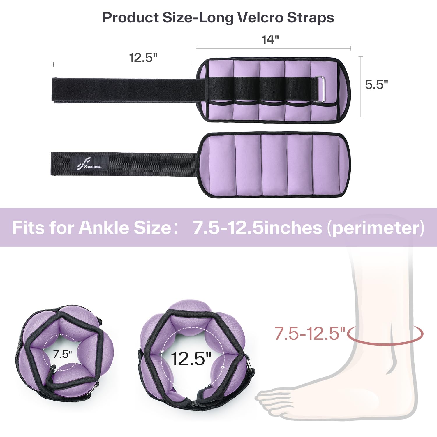 ONE SIZE FITS MOST ANKLES: The ankle weights feature long velcro straps(about 12.5inch), ensuring a comfortable and secure fit for size of ankle from 7.5 to 12.5 inches(perimeter)