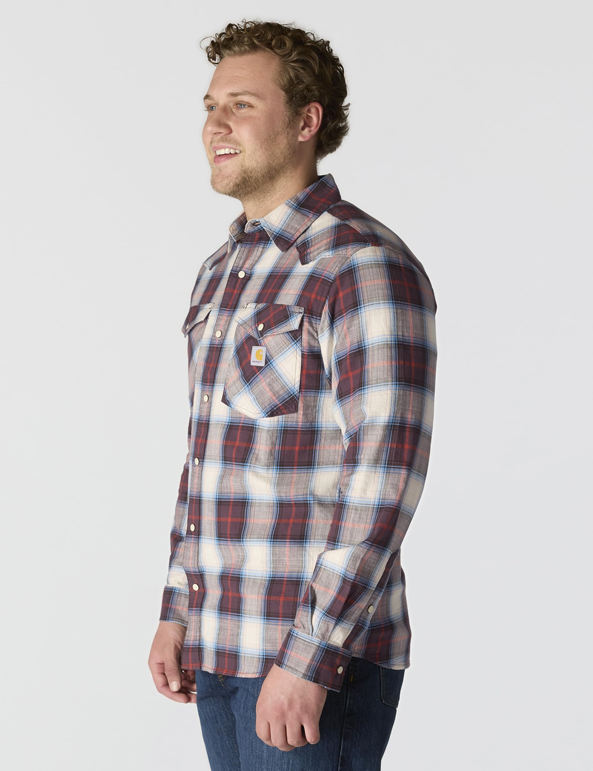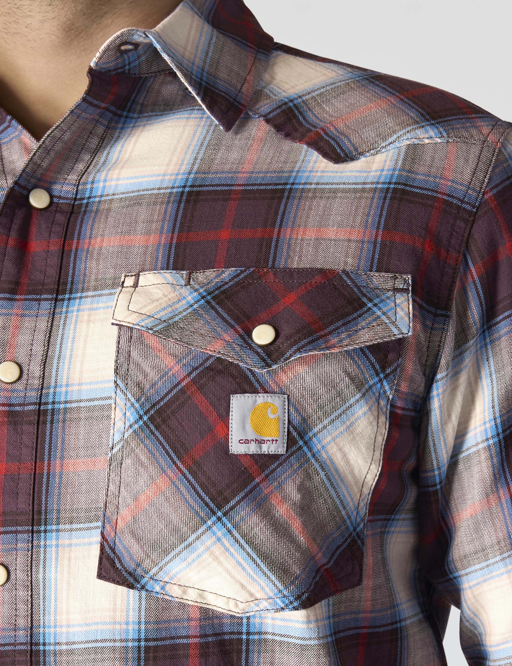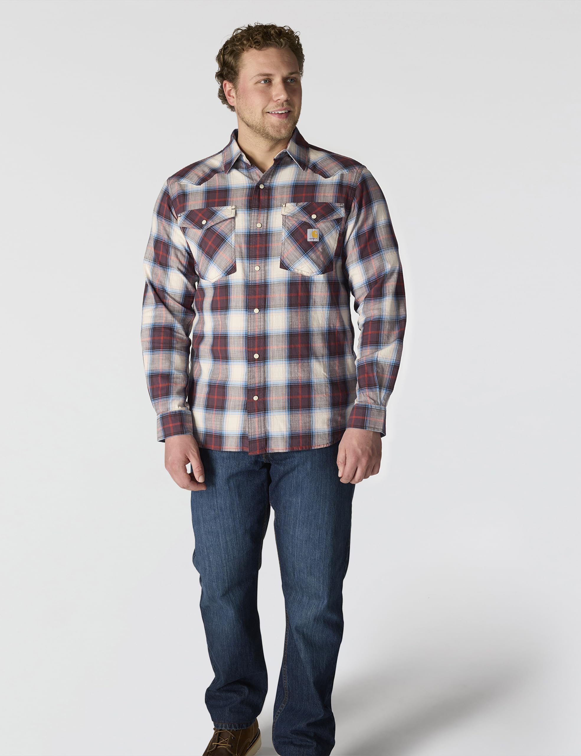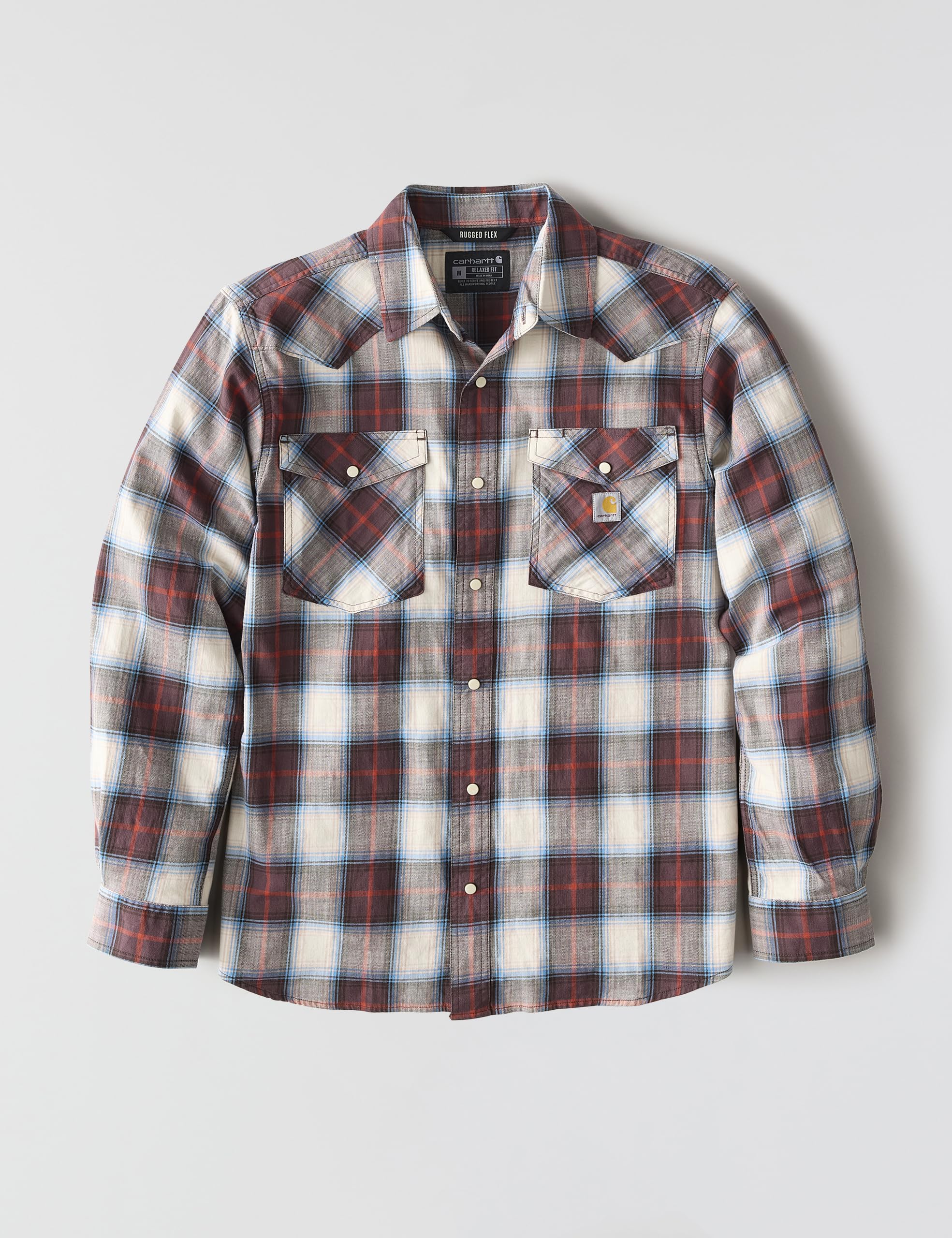 Description Made for unrestricted movement and cut to be worn tucked or untucked, this men's Carhartt snap-front plaid shirt features a lightweight cotton blend with just the right amount of stretch. A relaxed fit offers a little extra room to bend and move.
