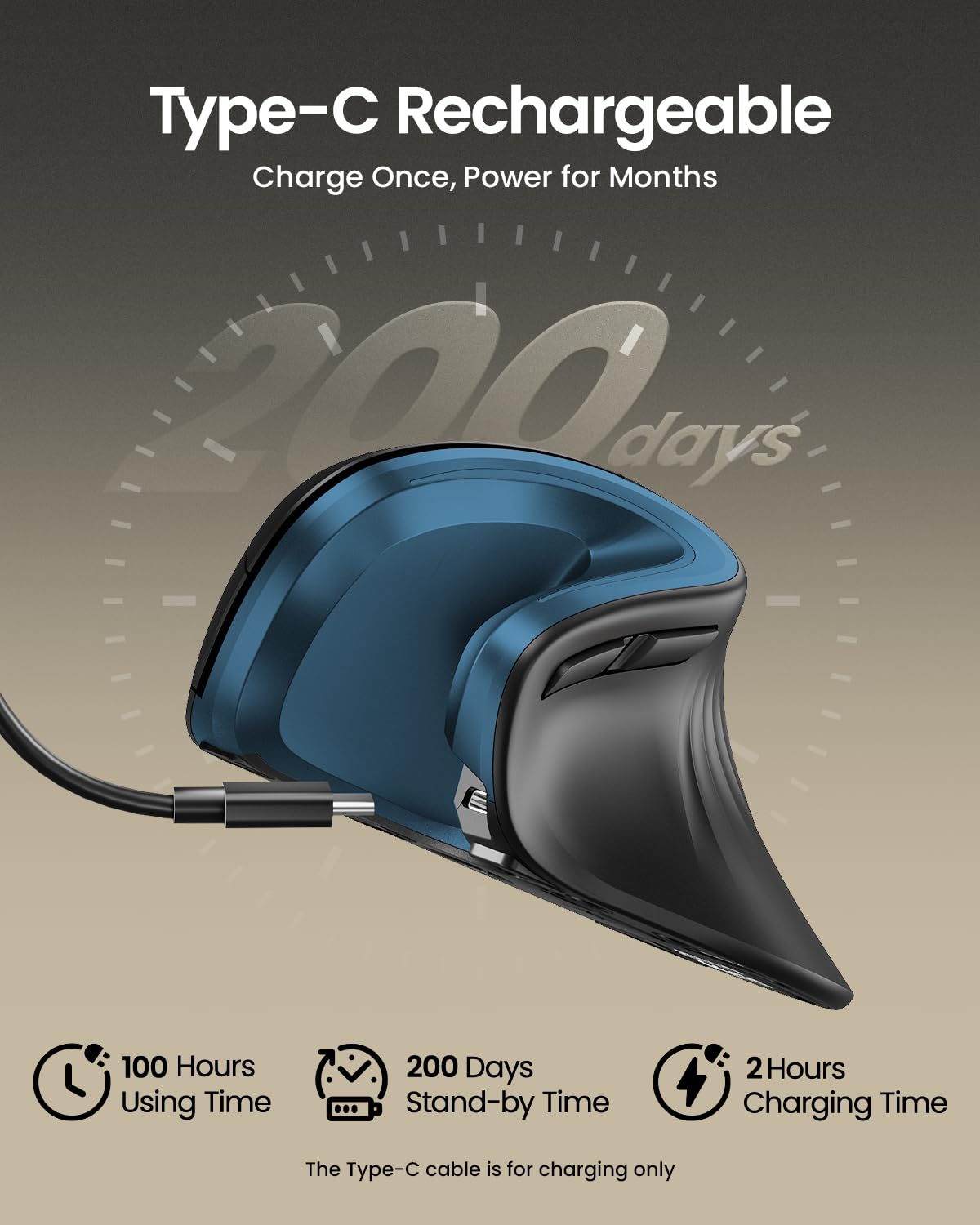 Rechargeable Ergonomic Mouse: The Bluetooth Vertical Mouse has a built-in 500mAh Li-Ion battery that can be conveniently recharged using the included Type-C cable(The Type-C cable is for charging only)