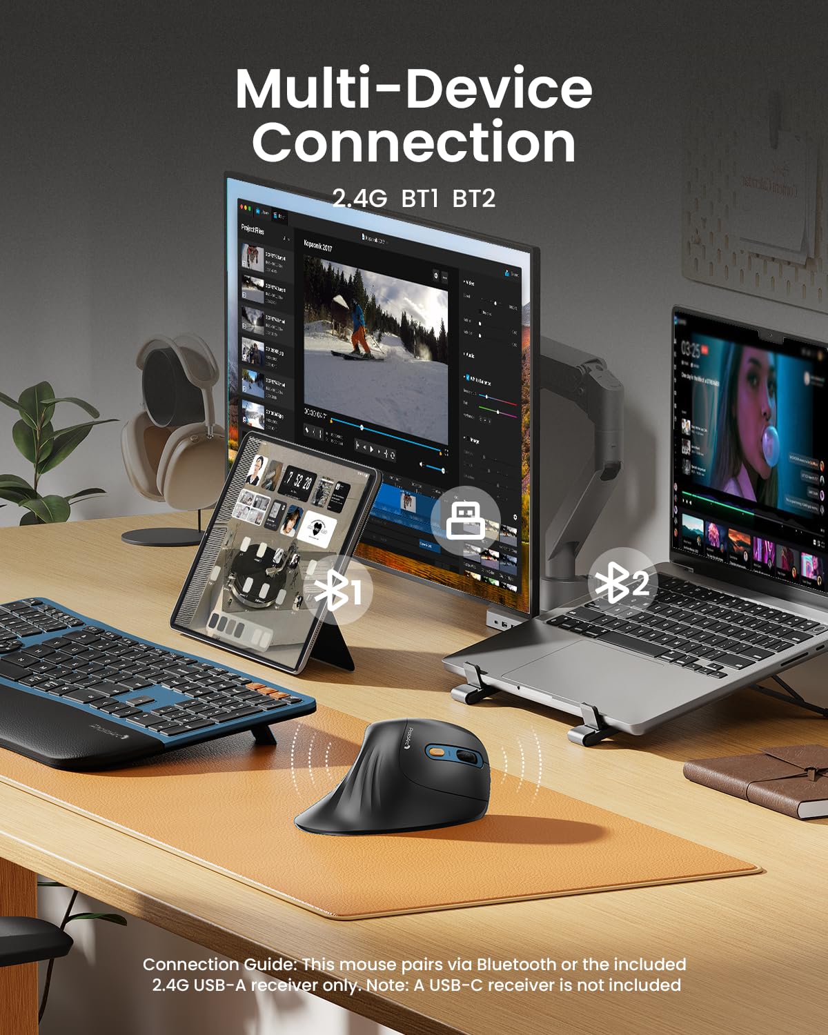 Connection Guide: This mouse pairs via Bluetooth or the included USB-A receiver only. Note: A USB-C receiver is not included. The Type-C cable is for charging