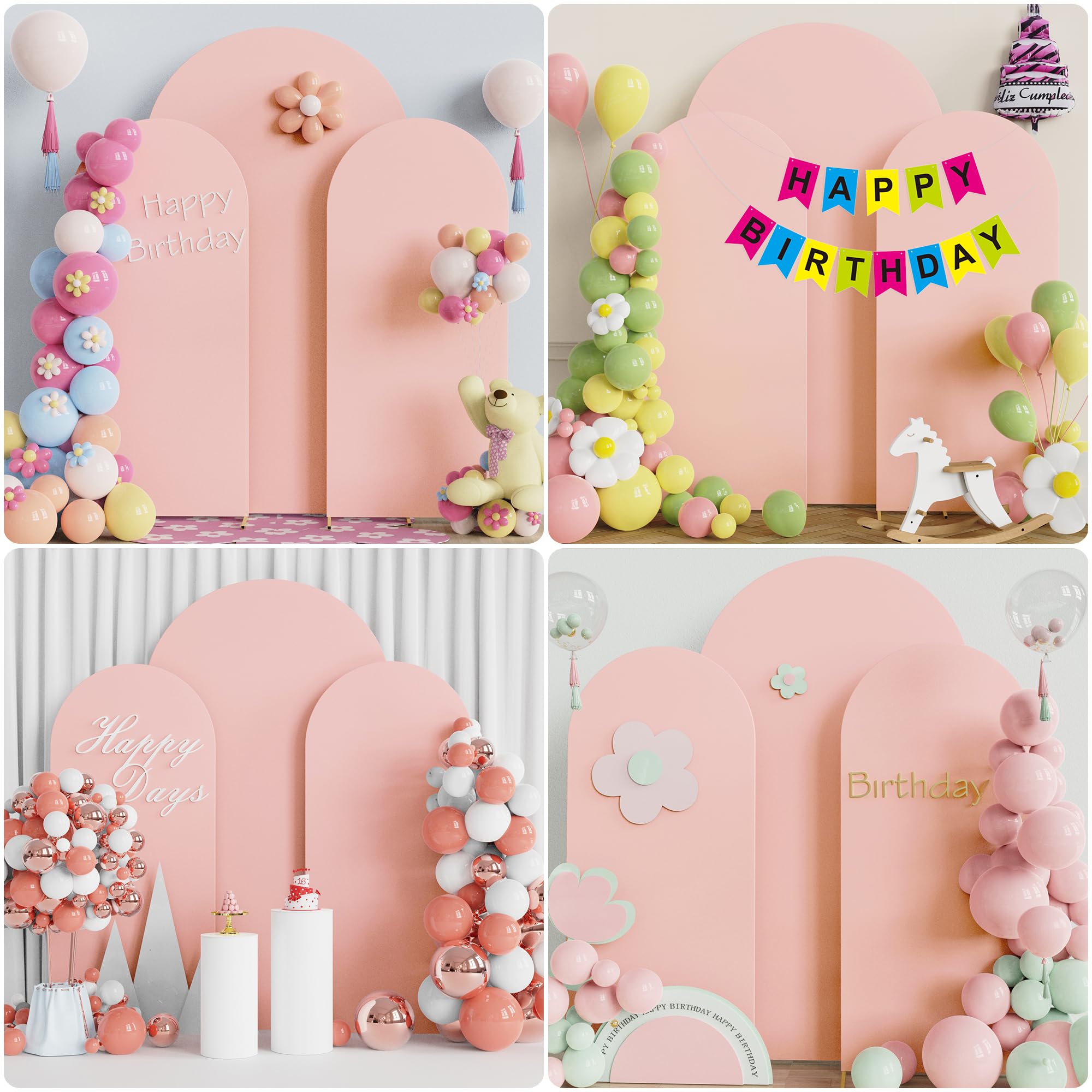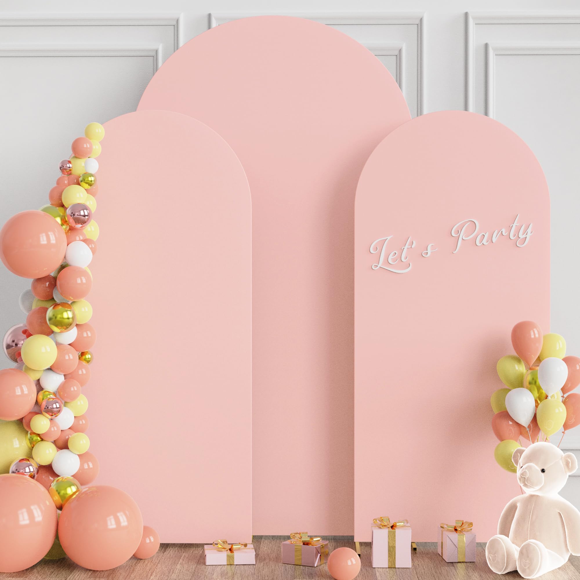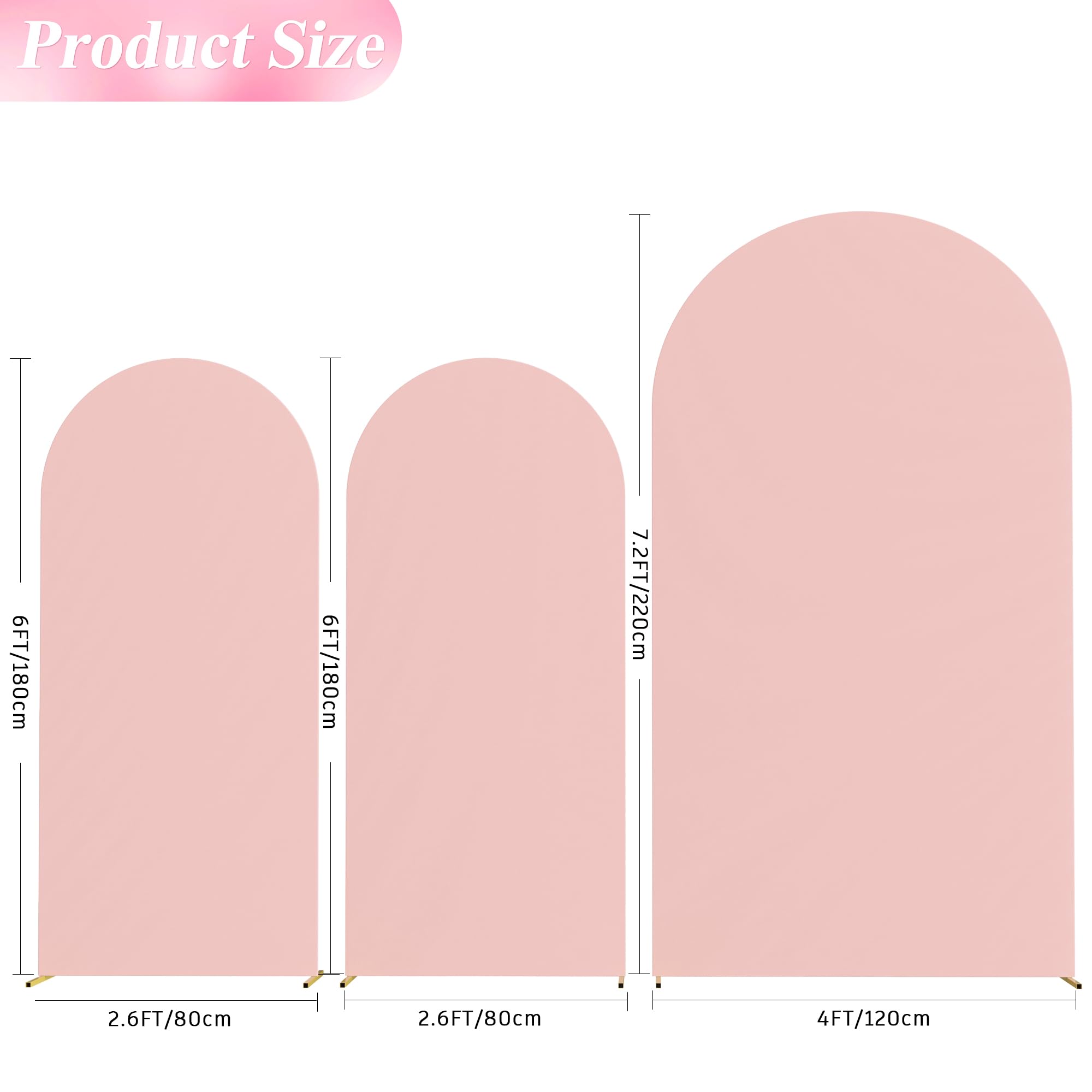 【Arch Covers Package】3 Piece wedding arch cover (Arch stand Not included). Material: Spandex. Color: Pale Pink. Size: 4 x 1.65ft (HxW) / 5x2.1ft (HxW) / 6x2.6ft (HxW). Decorate your party backdrop with our wedding arch covers to create an epic background for your celebration.