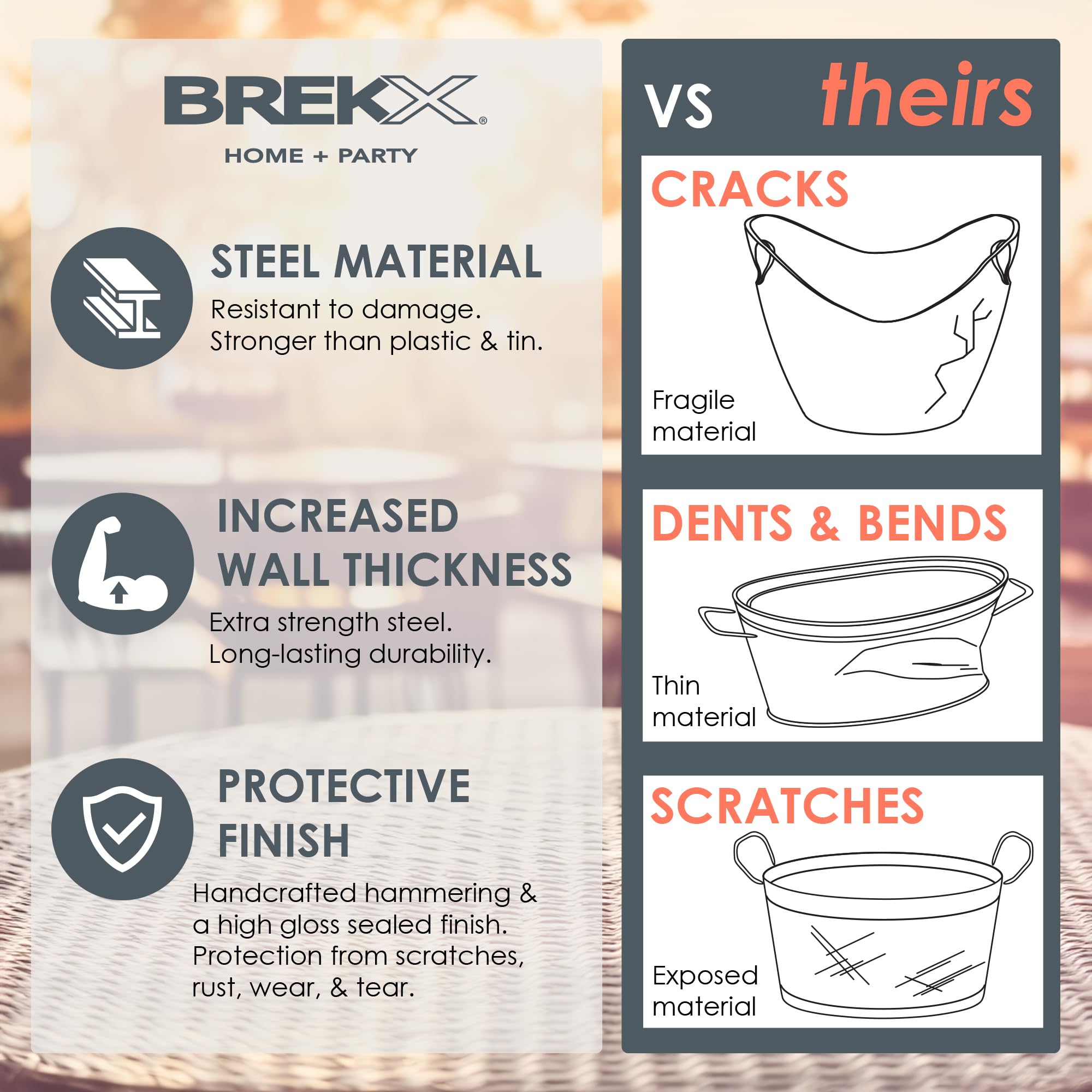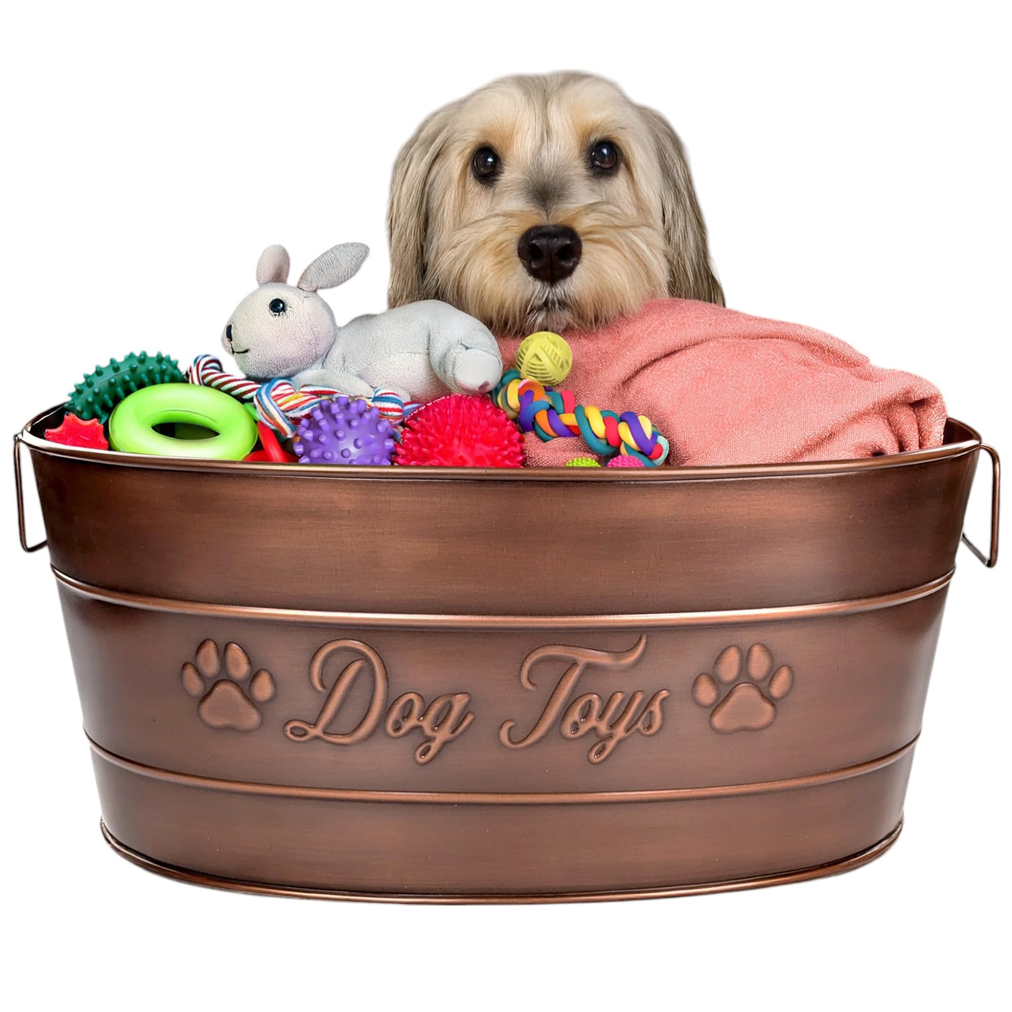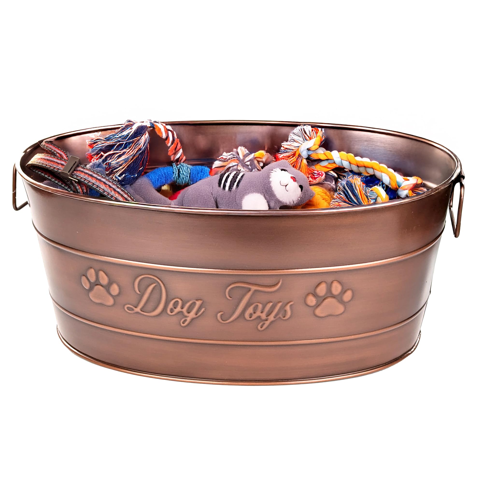 SPECIFICATIONS: Material: Heavy-duty galvanized steel large dog toy basket. Color: Antique Copper with "Dog Toys" Design. Size: 21”L x 14”W x 9”H. Capacity: 25qt / 6 gallon