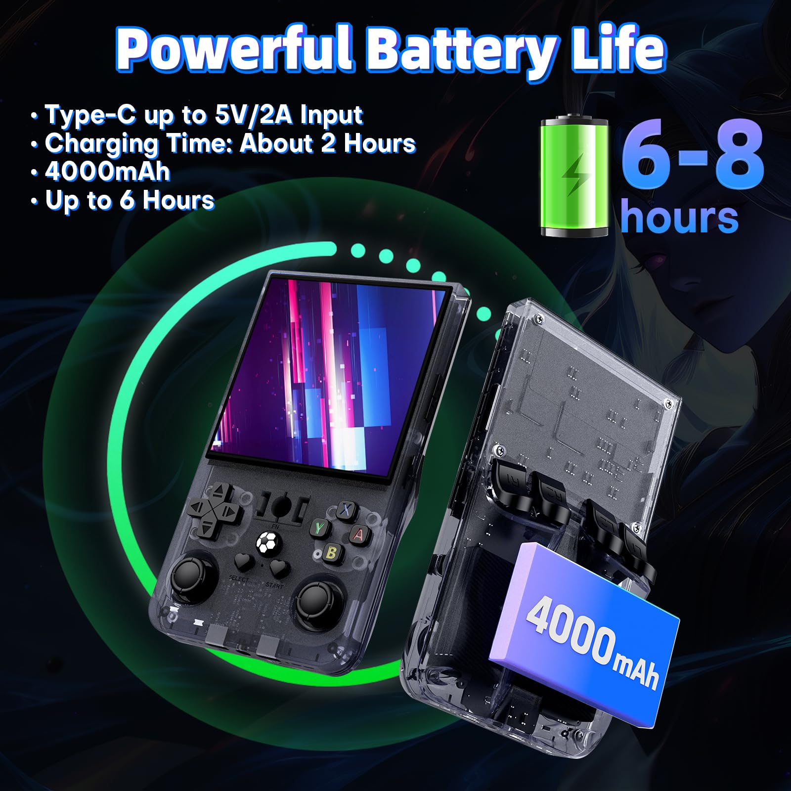 Portability Design with 4000mAh Battery: This retro gaming console is compact and lightweight. With 4000mAh large-capacity rechargeable battery provides up to 6 hours of battery life, allowing players to enjoy gaming anywhere, anytime. Brings lots of joy and happiness to you during a trip or a long journey