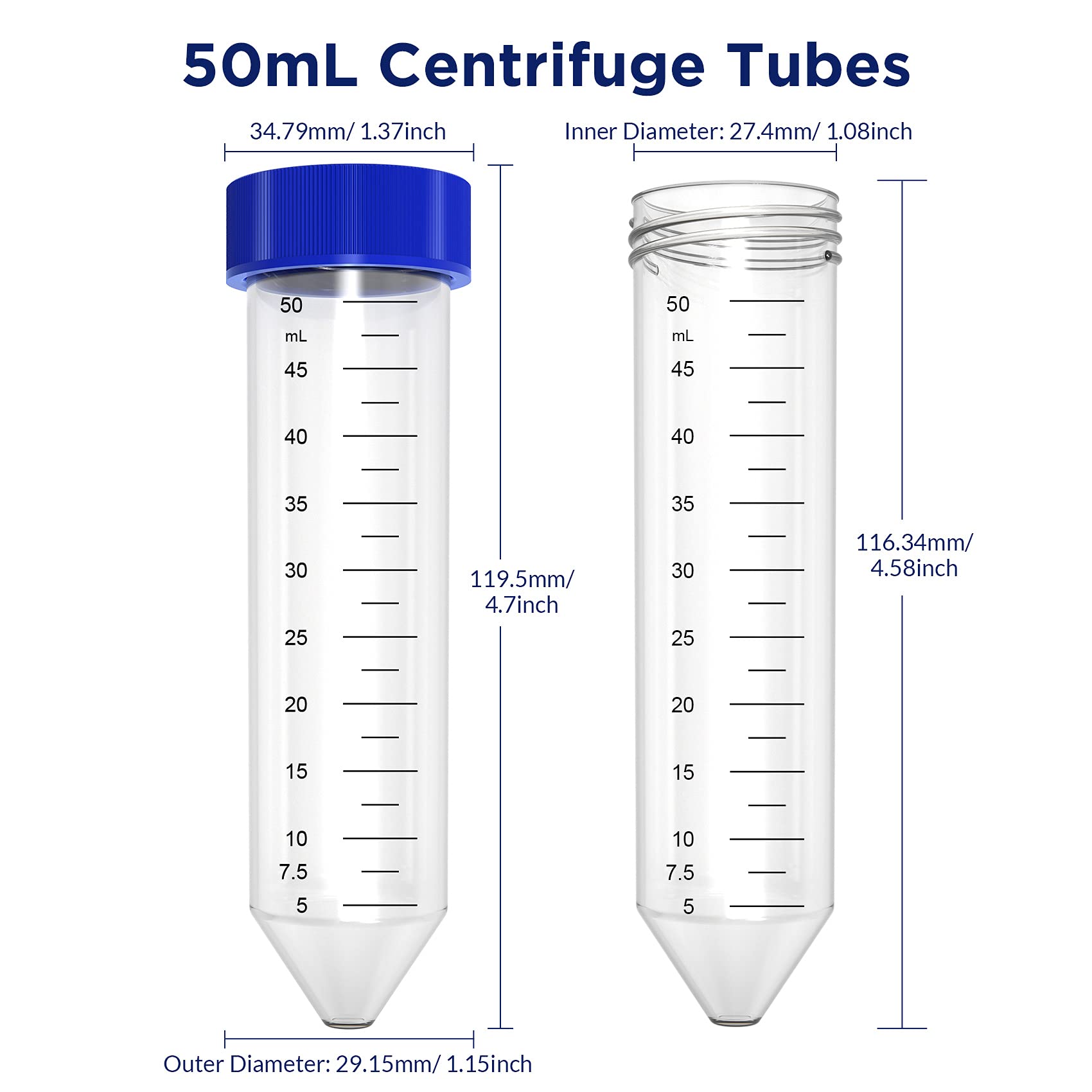 LEAK-PROOF - 50mL centrifuge tubes have longer length screw caps, which is used to prevent sample leakage and it smooth, flat inner surface, no residual solution.