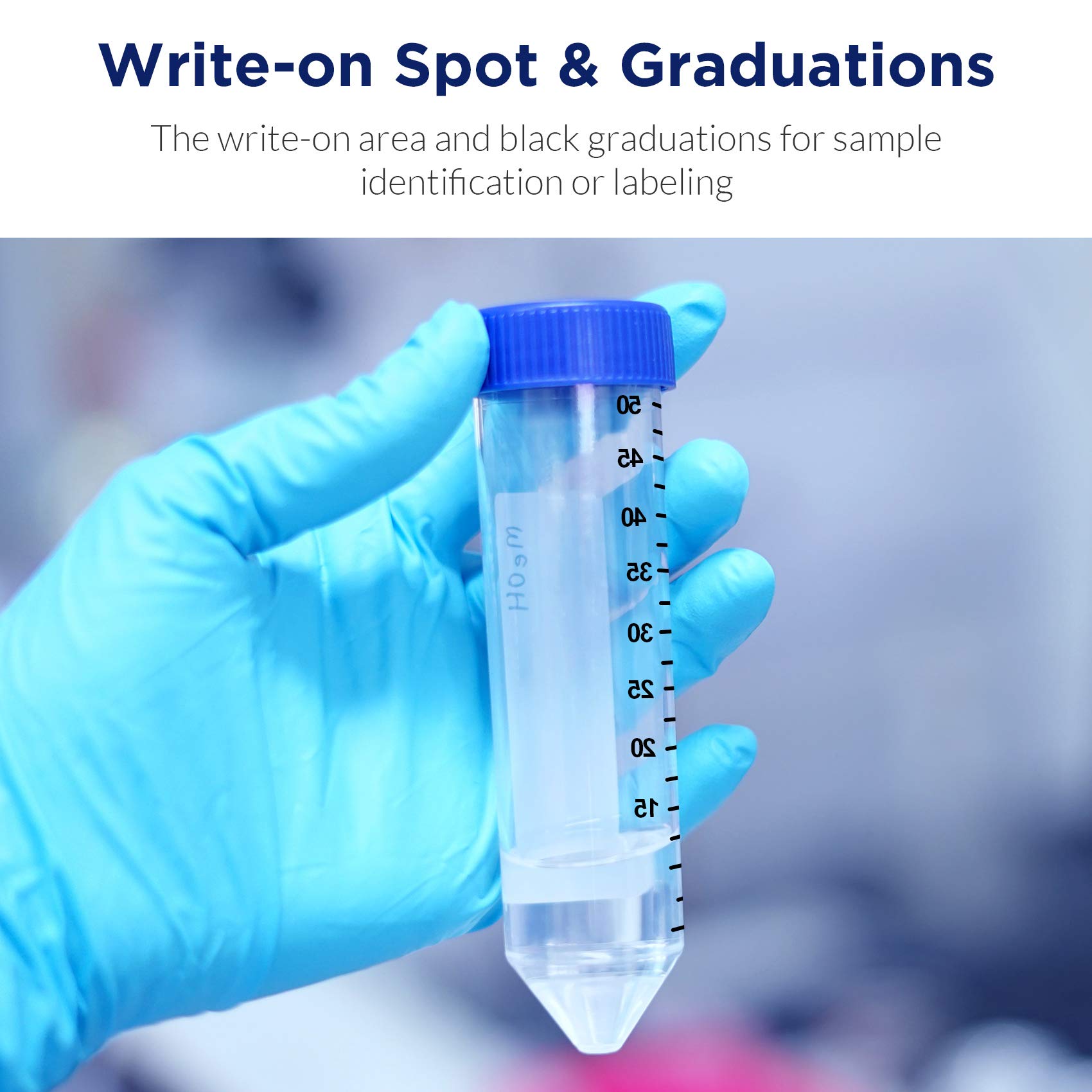 WRITING AREA - 50mL conical tubes With a large unerasable frosting white printed writing area provide easy and legible mark, and both the graduations and writing areas are chloroform-resistant.