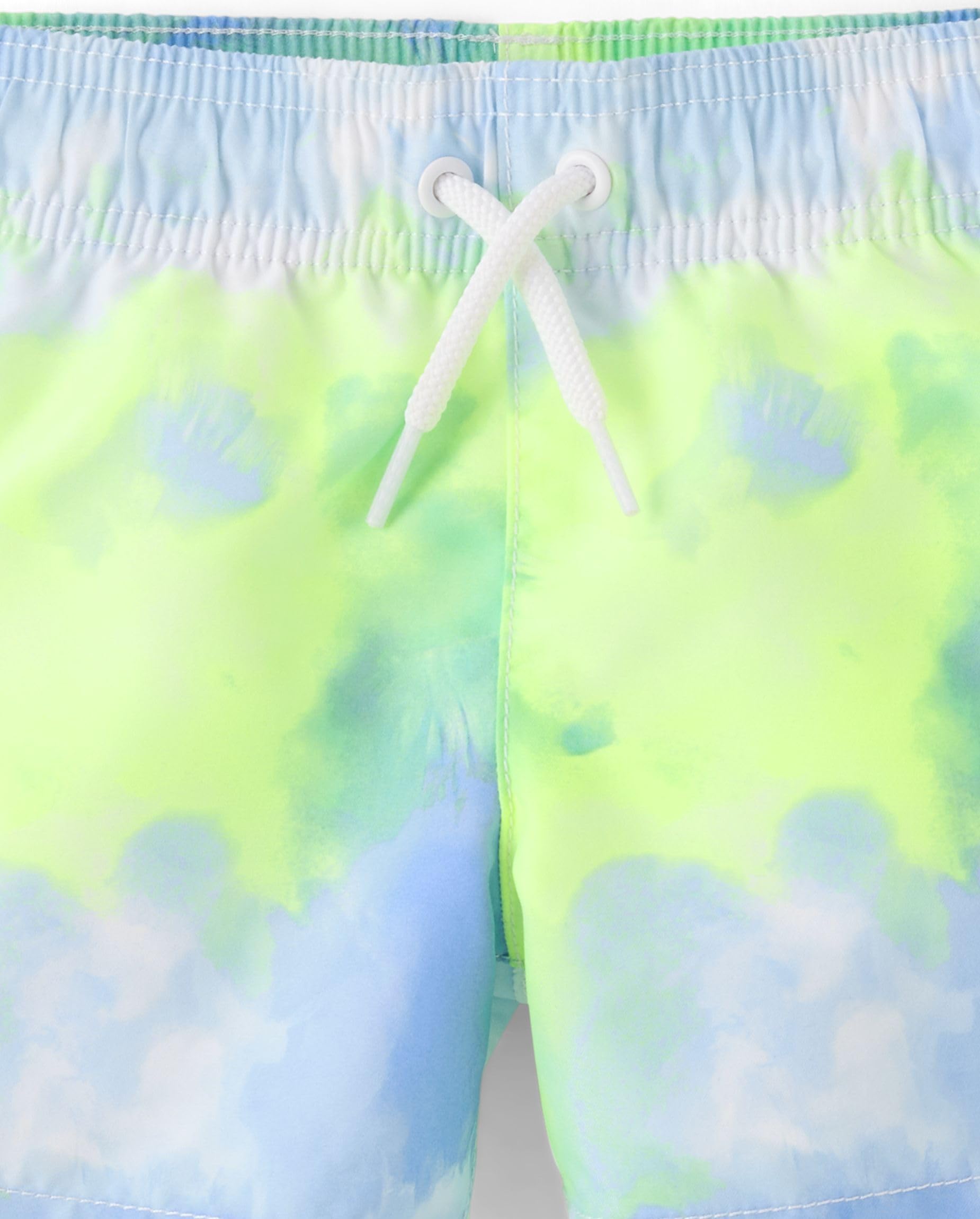 SWIM TRUNKS: Mesh lining, pull-on elasticized waistband with functional drawstring, above-knee length, allover print