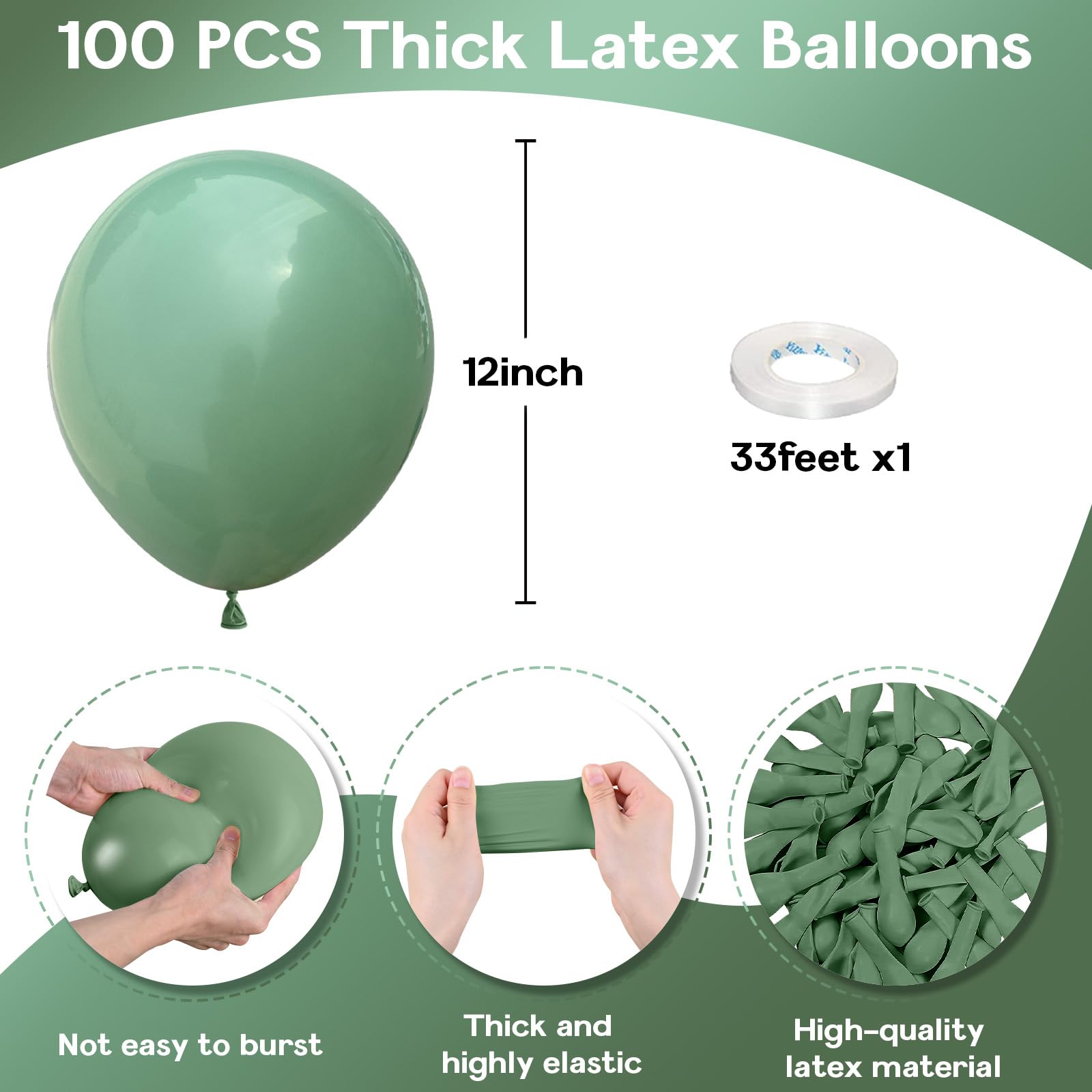 🎈 Round Balloons Set Includes - Each balloon kit contains 100pcs sage green 12 inch balloons for balloon arch kit balloon garland decorations and 1pc green balloon ribbon (total of 33 feet). The right quantity of party balloons and the most suitable color allow you to create a visually striking and captivating atmosphere that will leave your guests in awe.