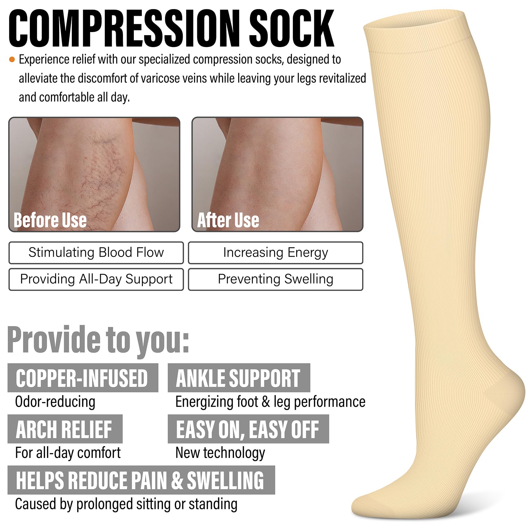 Ture Graduated Compression-Graduated compression is the most effective form of compression, and works differently than regular compression socks. Work by creating a 'pressure gradient' which helps to push oxygen-poor blood out of the feet and legs, and back to the heart. This improves circulation, boost energy levels, and relieves symptoms such as aches and pains, throbbing, swelling, blood pooling, provides the renewable and sustained energy and allows you to heal in the legs and feet.