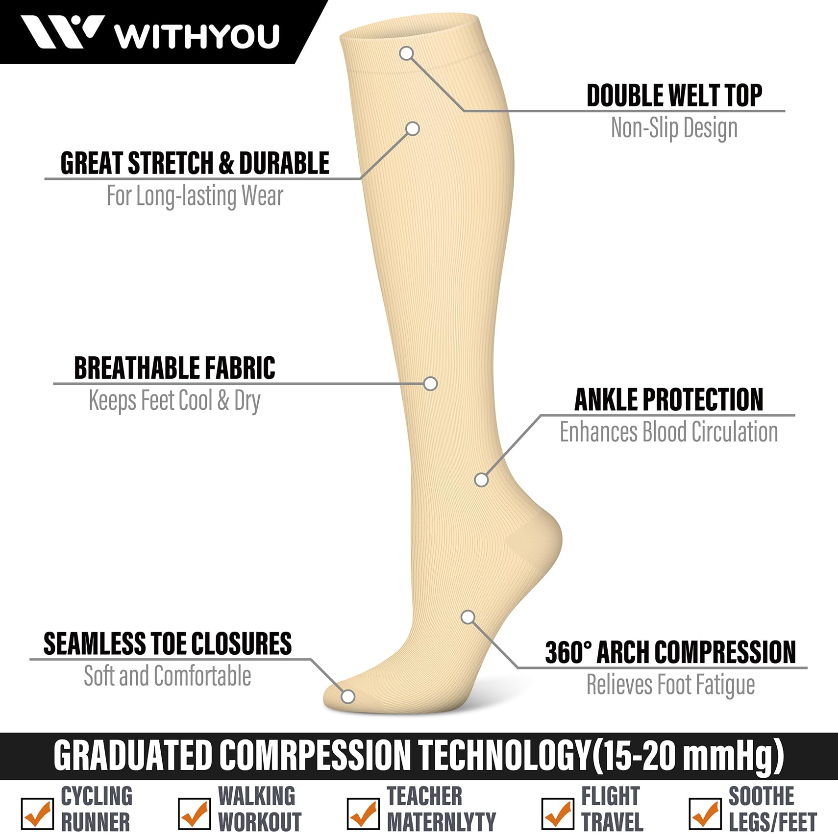 Our compression socks are perfect for anyone, in any stage of life.Everyone can benefit from the power of compression. Whether you are a nurse, marathon runner, teacher, athlete, expectant mother, world traveler, or recovering from an injury, these compressions socks will help to prevent pain, fatigue, swelling and cramping in lower extremities while improving circulation and overall comfort.