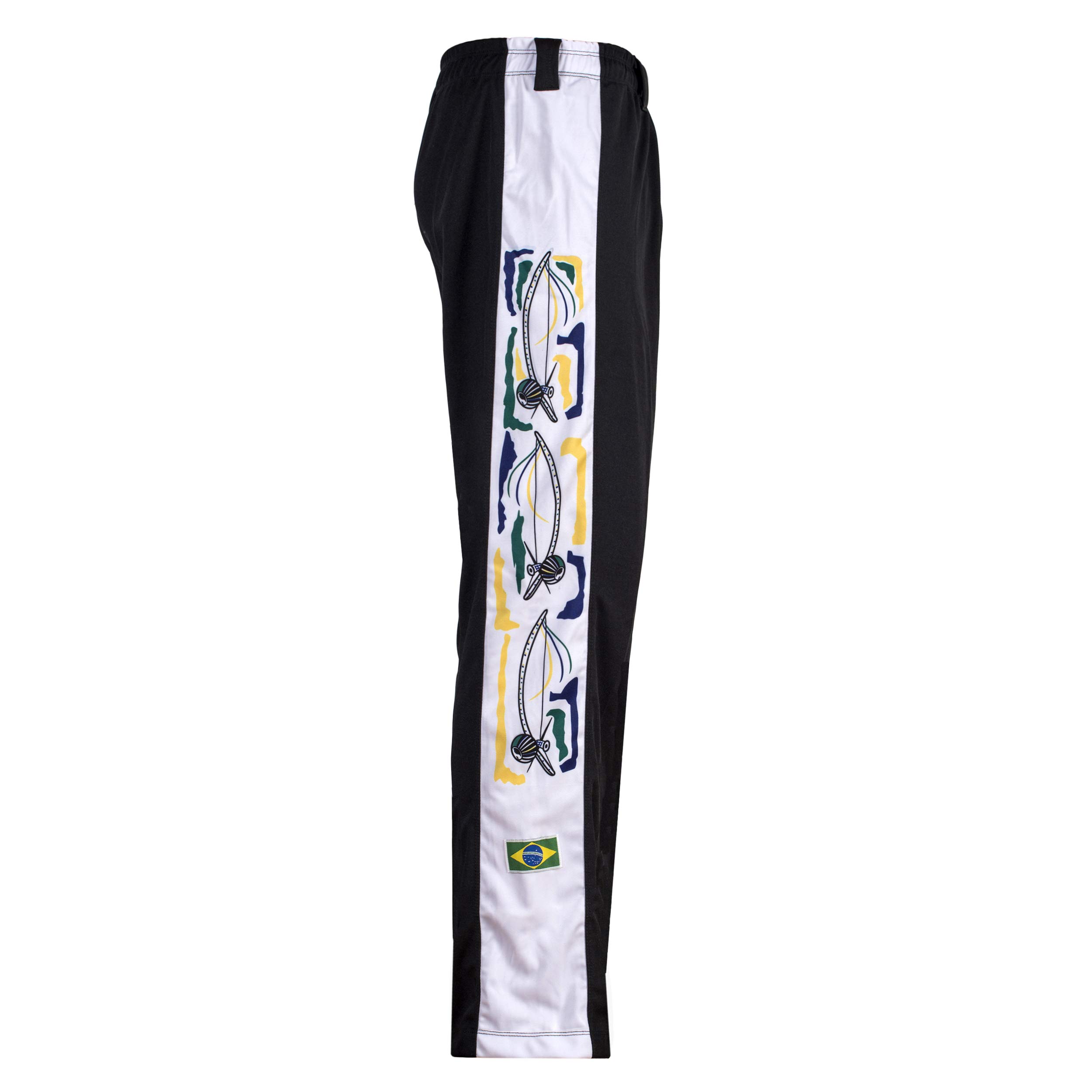 Description These unisex athletic bottoms were designed specically for the Brazilian martial art of Capoeira, but have a simple sporty design perfect for all types of exercise or casual wear. These pants have an elasticated waistband and a drawstring for a secure fit. They are made out of a light, synthetic fabric that allows you to move and exercise without constraint and stay cool while doing so. The design features a Brazilian flag attached on the front bottom of the pants and a wide stripe with a Berimbau along each leg. The pants are ideal for all outdoor and indoor activities such as Yoga, Aerobics, Jogging, Pilates, Kickboxing and more. **Size Guide- **5-6 - Full Length - 67 cm/ 26.5", Inner Leg Length - 48.5 cm/ 19" , Waist - 48 - 58 cm/ 19 - 24" **7-8 - Full Length - 71 cm/ 28", Inner Leg Length - 51 cm/ 20" , Waist - 56 - 66 cm/ 22 - 26" **9-10 - Full Length - 78 cm/ 31", Inner Leg Length - 58 cm/ 23" , Waist - 62 - 82 cm/ 24 - 32" **11-12 - Full Length - 84 cm/ 33", Inner Leg Length - 64 cm/ 25" , Waist - 66 - 86 cm/ 26 - 34" **13-14 - Full Length - 90 cm/ 35", Inner Leg Length - 68 cm/ 26.5", Waist - 68 - 88 cm/ 27 - 34.5"
