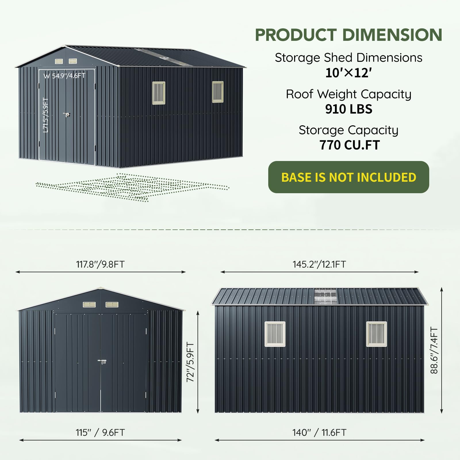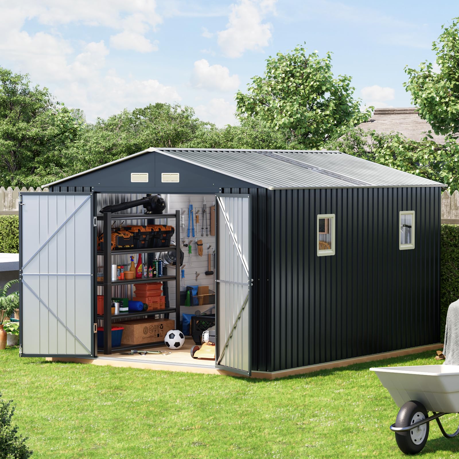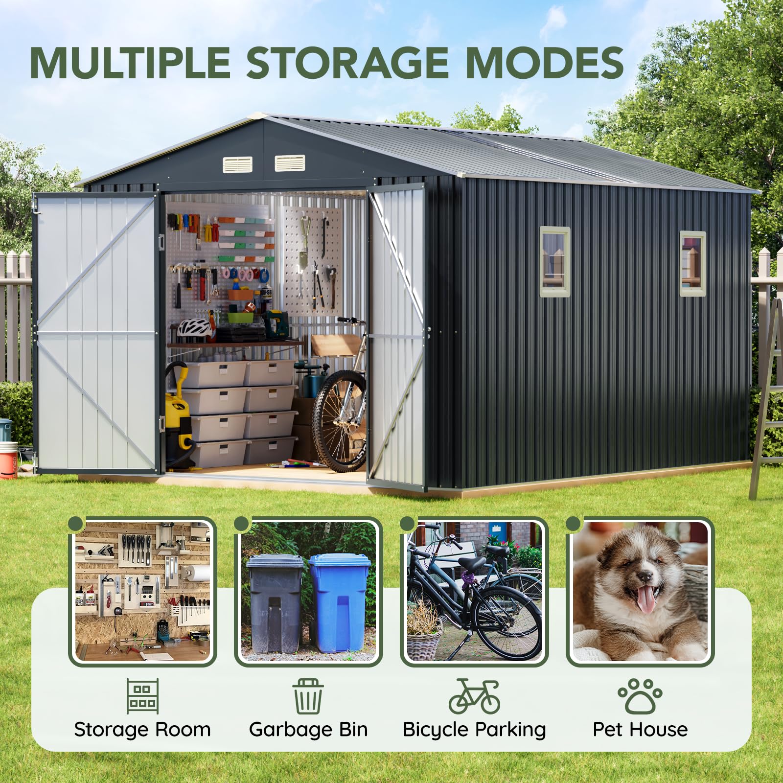Spacious 10x12 FT Storage Capacity – Provides ample space for storing bikes, lawn tools, garden supplies, and seasonal equipment. Perfect for backyard, patio, or garden use.