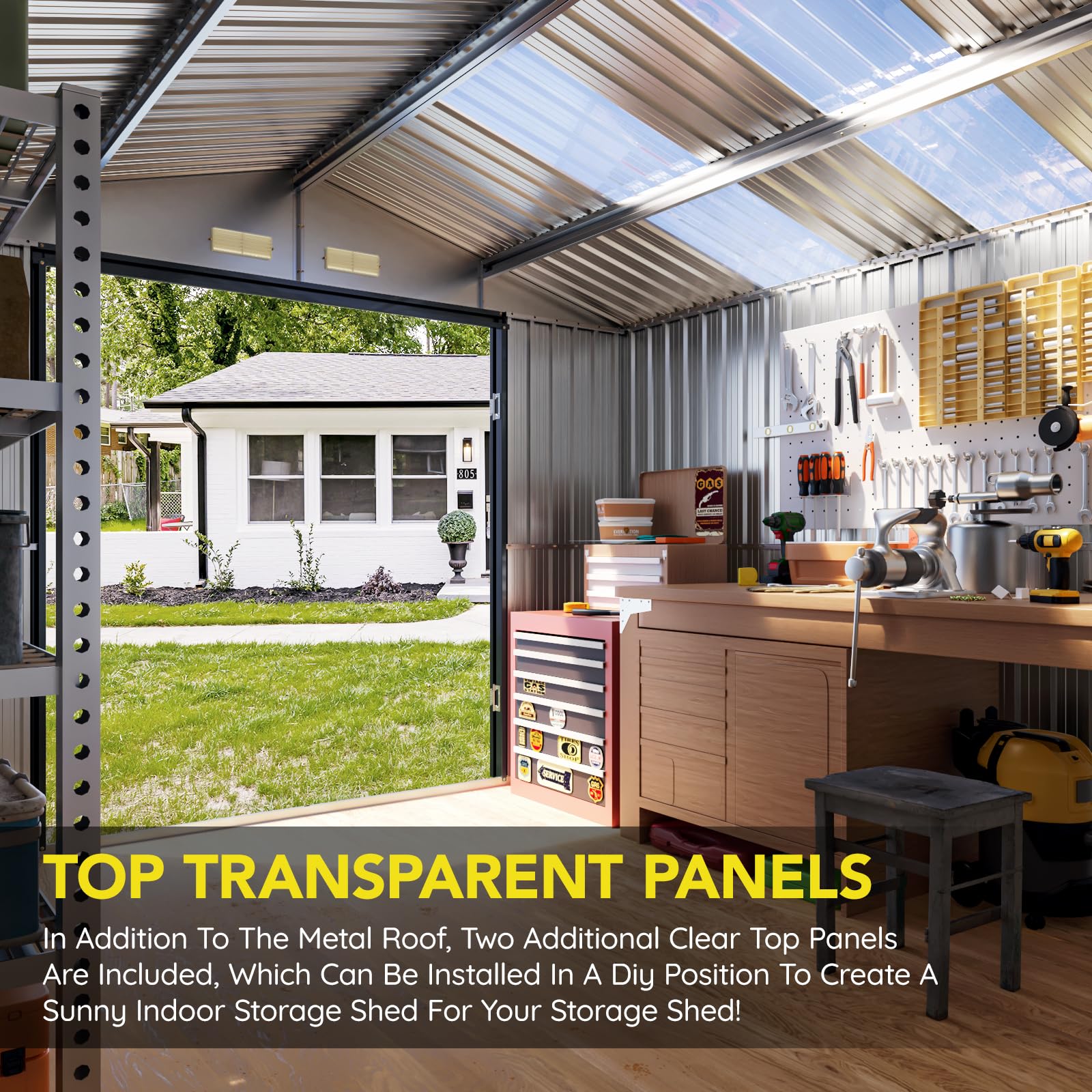 Replaceable Skylight Roof Panel – The translucent roof panel can be easily replaced to maintain brightness inside the shed over time.