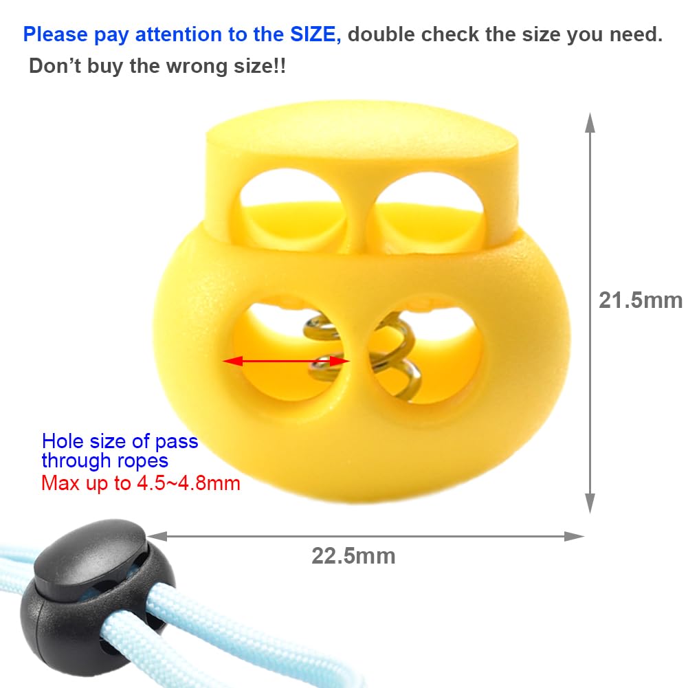 Product Included : 10 Pack Yellow Plastic Bungee Cord Locks (the cord excluding) ,Outter Size : 22.5 x 21.5mm ,Hole Dia. Just can Pass through Max up to 4.5~4.8mm Drawstring Ropes