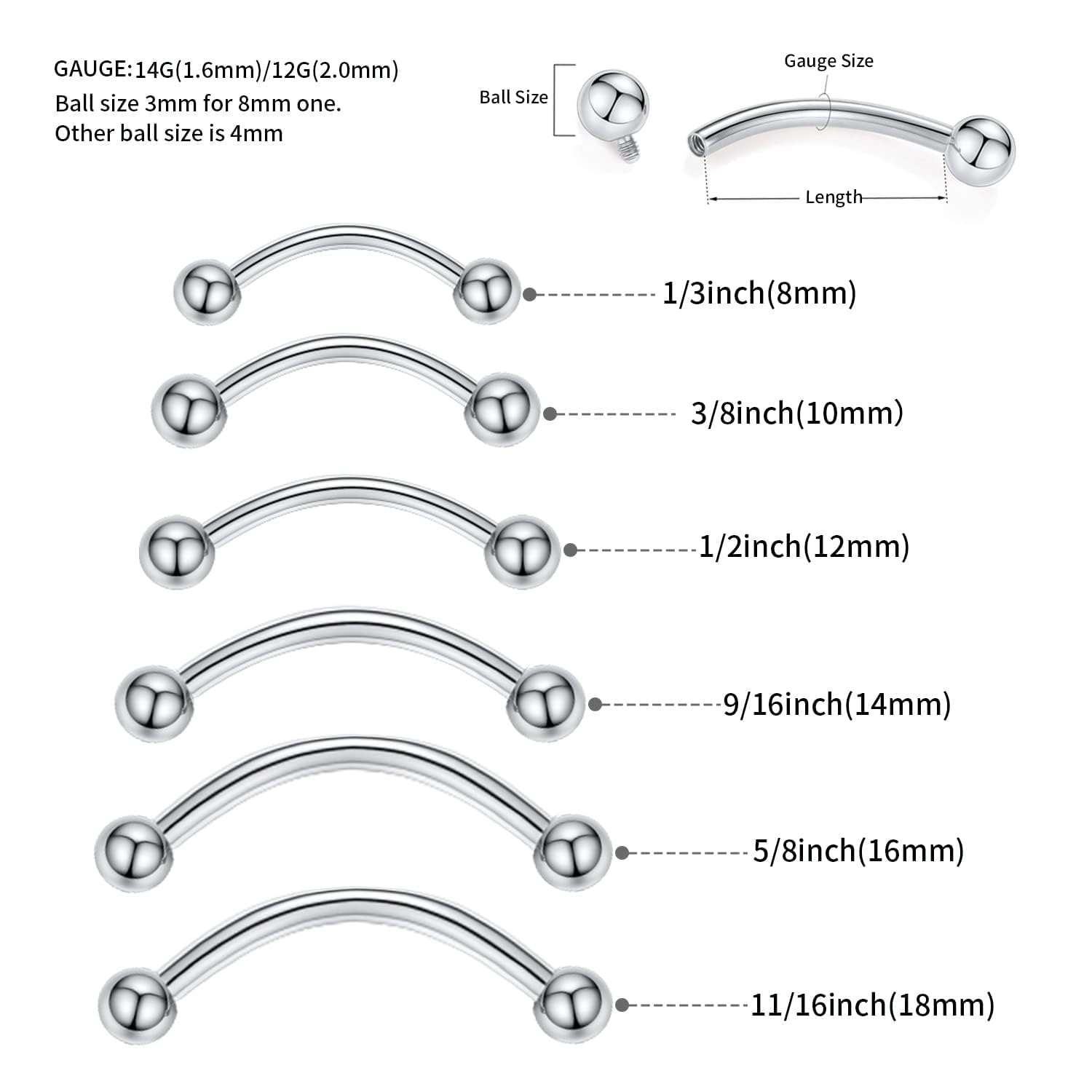 Curved Nipple Barbell Size: 16 G (1.2 mm); Bar Length: 9/16"(14 mm); Ball Size: 3 mm; Color: silver