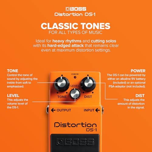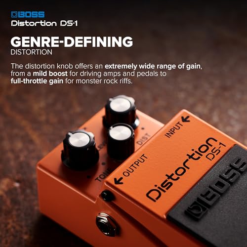 Introduced in 1978, BOSS’s first distortion pedal defined a bold new sound, delivering hard-edged attack and smooth sustain that’s been a staple of players for generations. The DS-1 is the top-selling BOSS compact pedal ever, and its original, unchanged design continues to inspire the creation of great music everywhere. The classic DS-1 tone is behind the signature sounds of numerous rock legends, and is ready to fuel your own signature sound today.