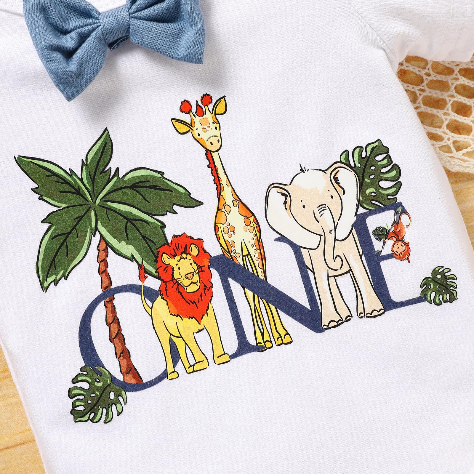 ð¯ãWild One 1st Birthday Romper HeadbandãAnimal outfit baby boy, white short sleeve bodysuit with bowtie. 1st Birthday, Lion Tail, Giraffe, Tiger to convey to meaning of forest animal theme one year old pictures. letter âWild Oneâ . First birthday photos with the wild one outfit for first birthday party supplies, wild one birthday decorations;