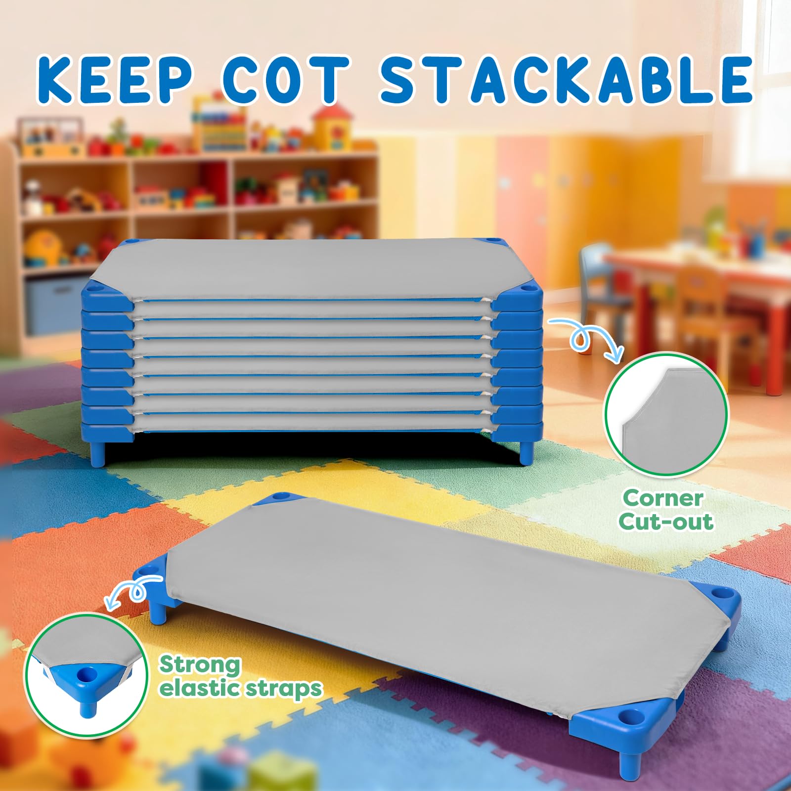 Keep Cot Stackable: Corner cut-out design, our cot sheets for daycare standard size ensures cots still stackable, no blocking when stack cots up, perfect daycare must have