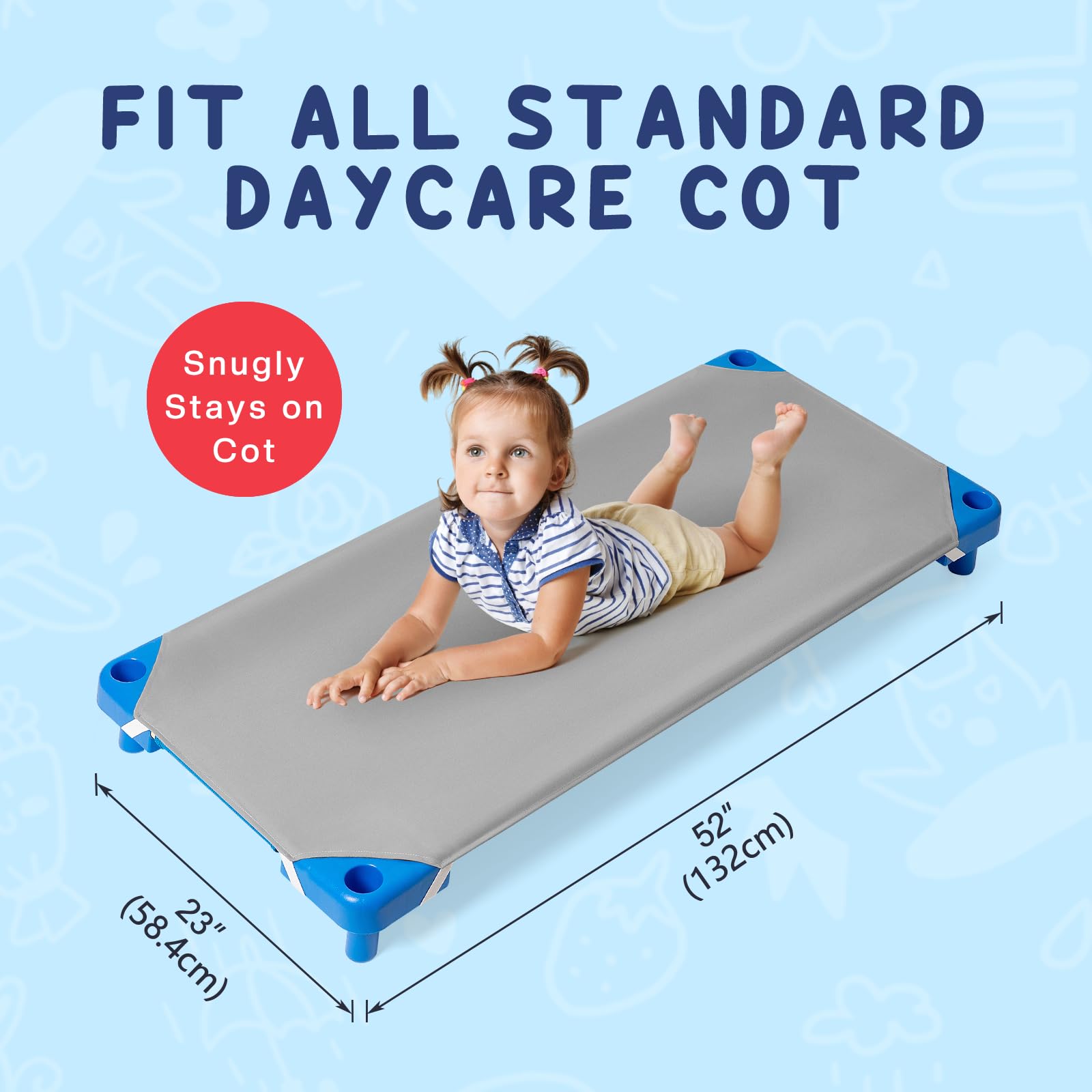Fits Standard Size Daycare Cot: Measures 23"W by 52"L, our fitted cot sheets for toddler fits standard size daycare cot, pre-school cot, toddler nap sleeping time cot
