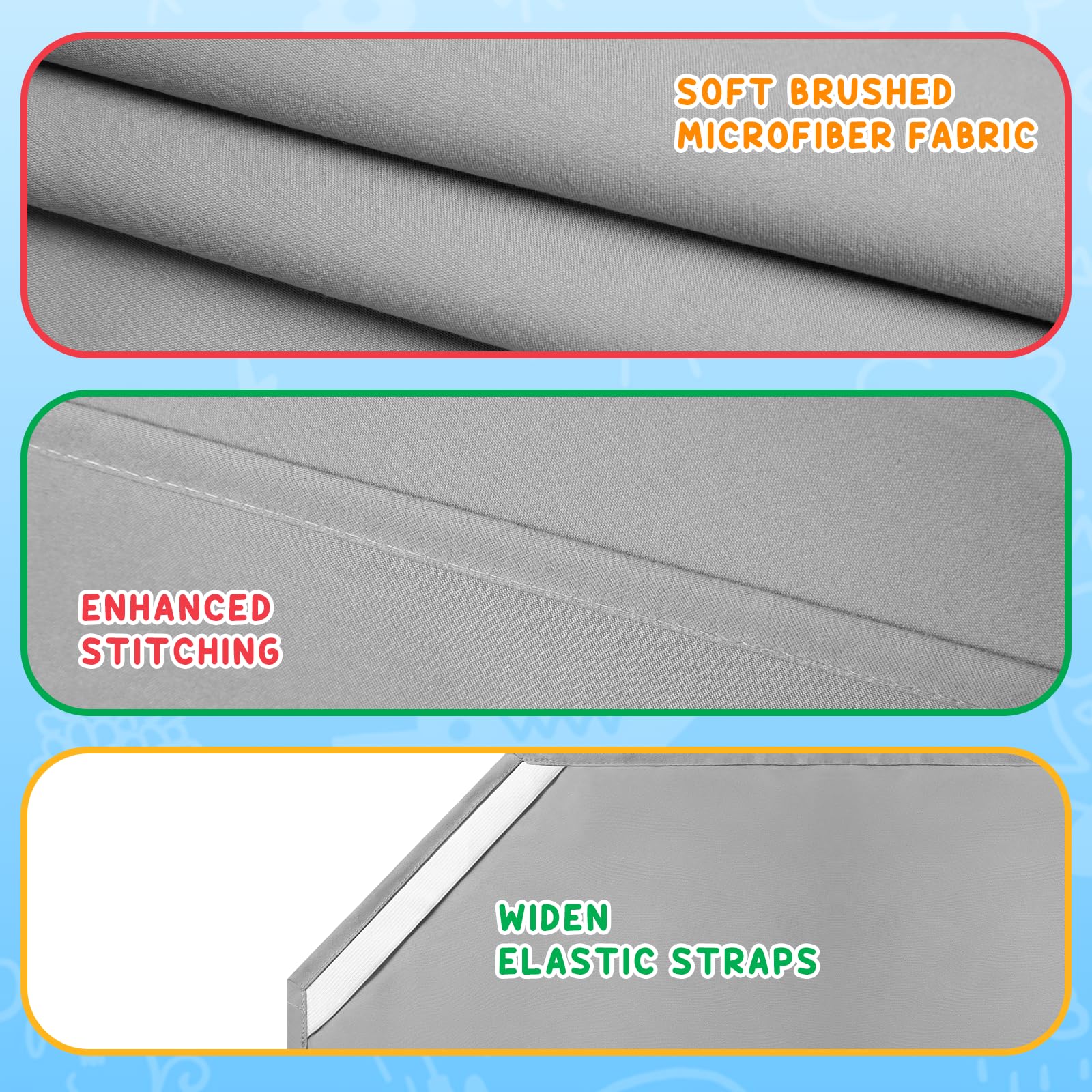 Durable Elastic Straps: With widen & reinforced elastics at 4 corners, our toddler cot sheets for sleeping keeps securely in place, prevent shifting during use