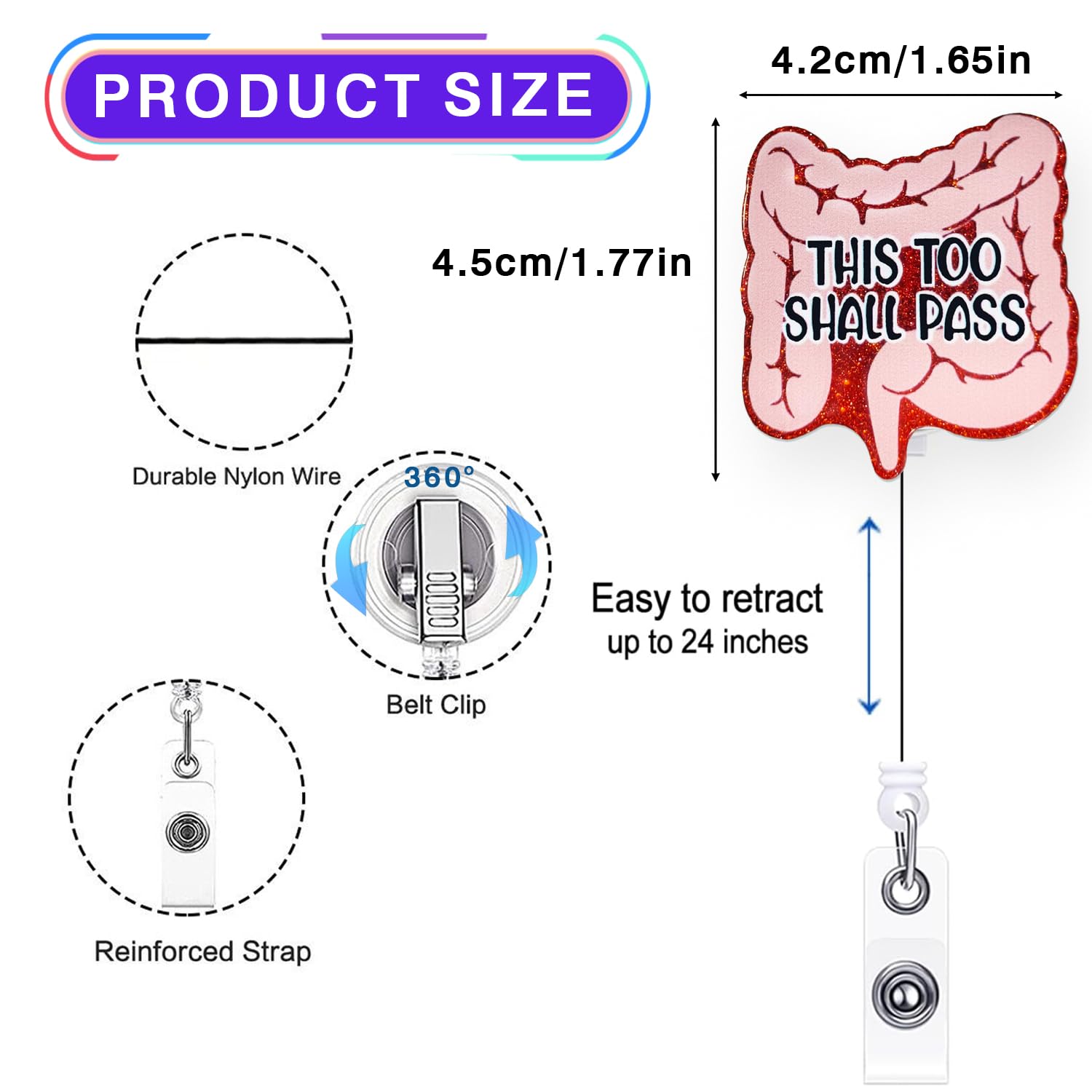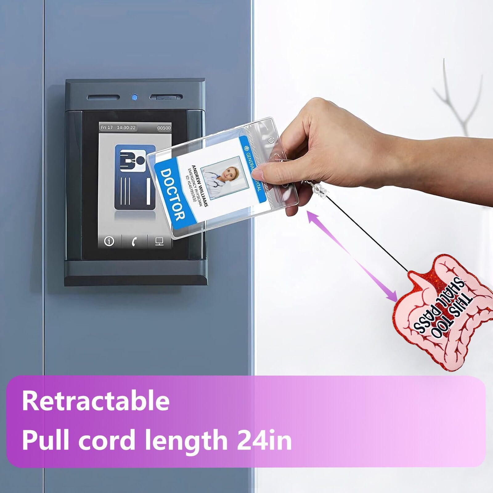 【Retractable Cord】The retractable reel cord extends a maximum of 24 inches, more than enough to reach comfortably as far as your arm can reach. The flexible retractable feature enables you to effortlessly display your badge without removing it, enhancing your efficiency at work.