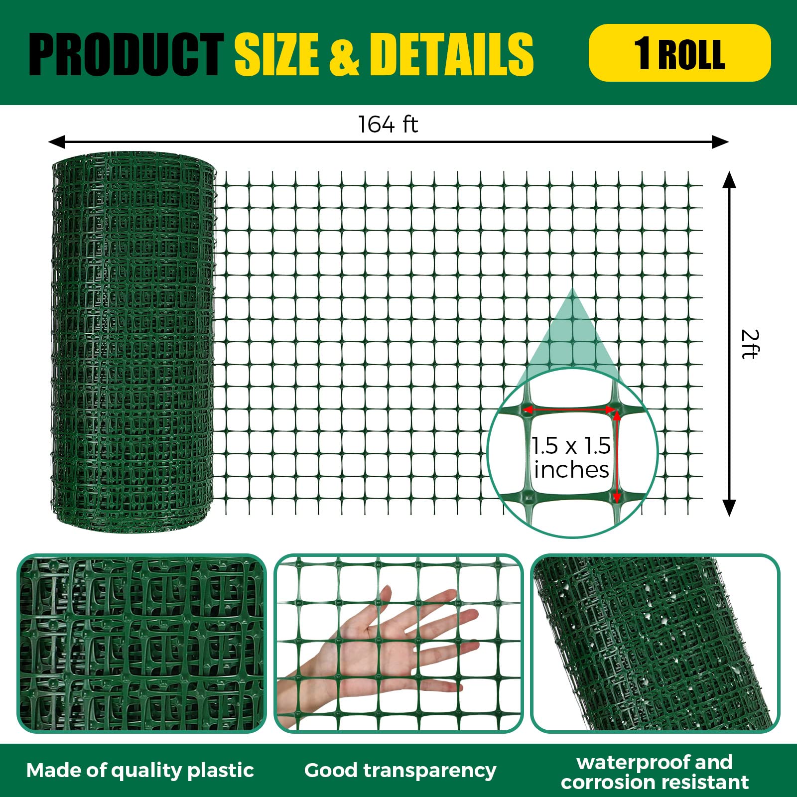 Features: Easy to install and remove: The plastic animal fencing is easy to install and remove in minutes, you can nail the netting fence to a wooden post, wrap them around a tree, or attach it to a pole effortlessly. When you no longer need the temporary plastic fence, it can be rolled up and easily stored for future use. Wide applications: The plastic mesh fence is lightweight, practical and convenient, it can be applied to create temporary outdoor activity places for poultry, chickens and dogs, and the plastic garden fencing can also protect flowers, vegetables, construction sites, workplaces, etc. Specifications: Material: plastic Color: green Size: 2' x 164' Package includes: 1 Roll plastic mesh fence Notes: Manual measurement, please allow slight errors on size. The color may exist a slight difference due to different screen displays. The knife or scissors mentioned above is not included in the package