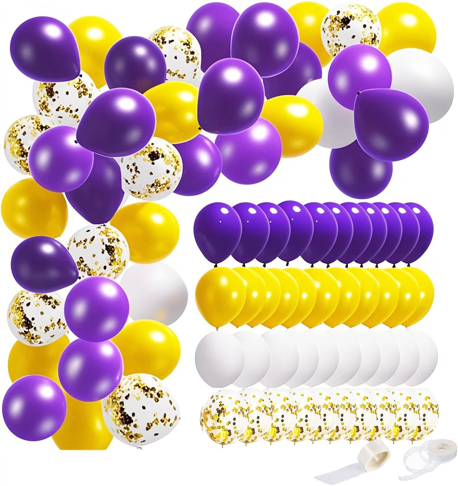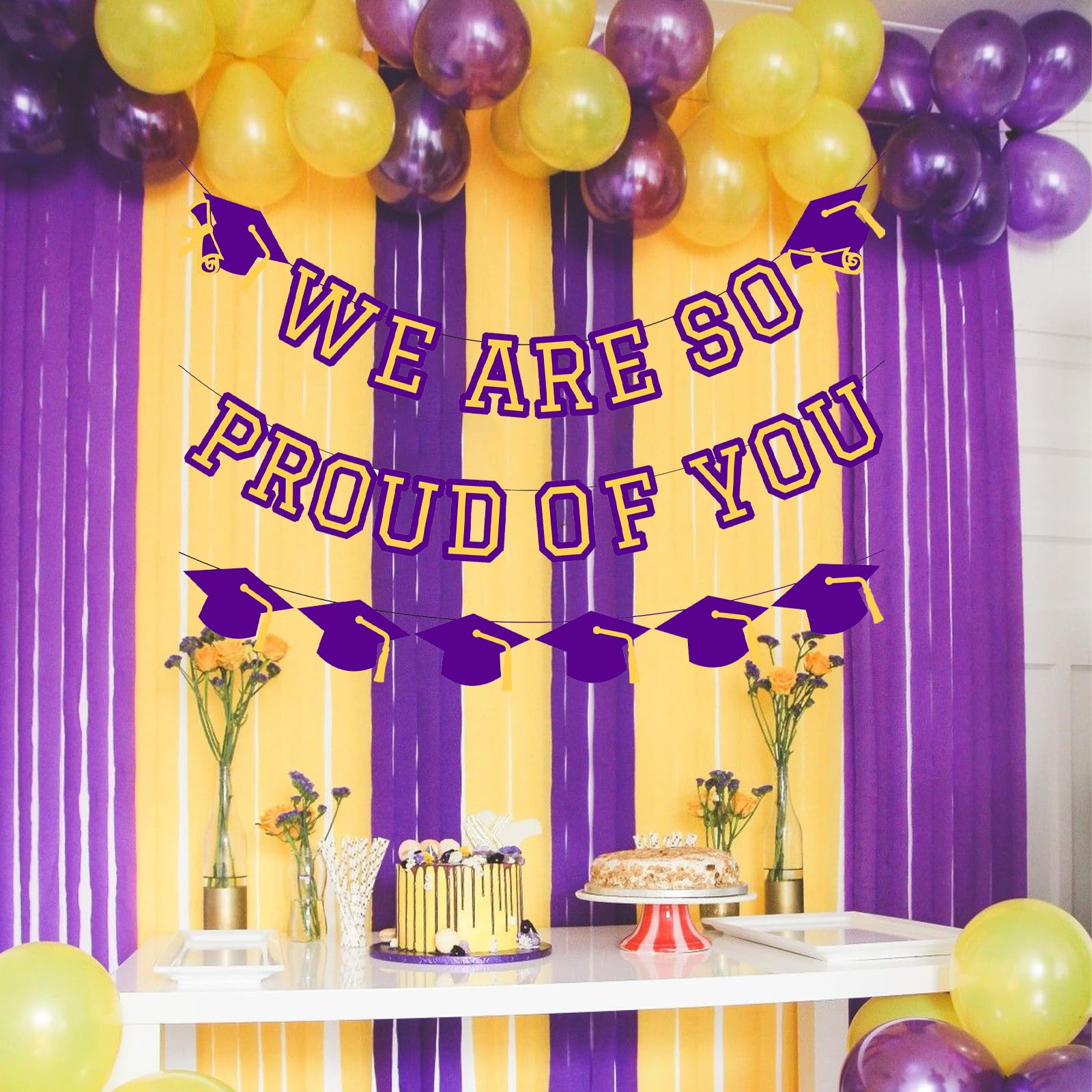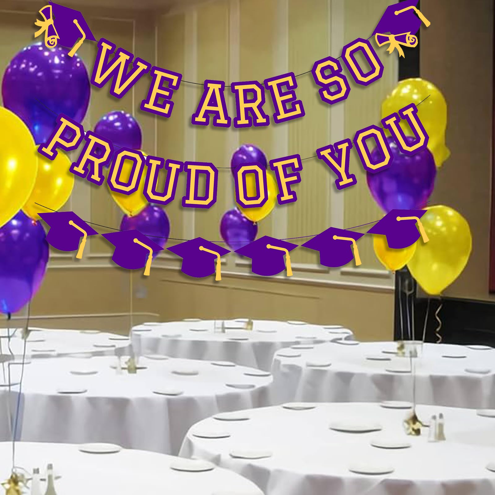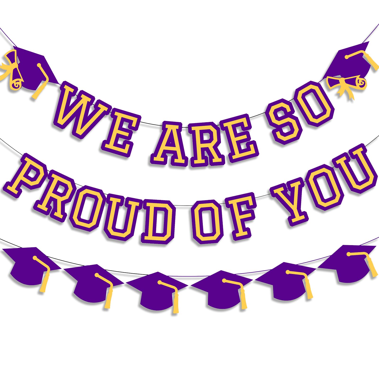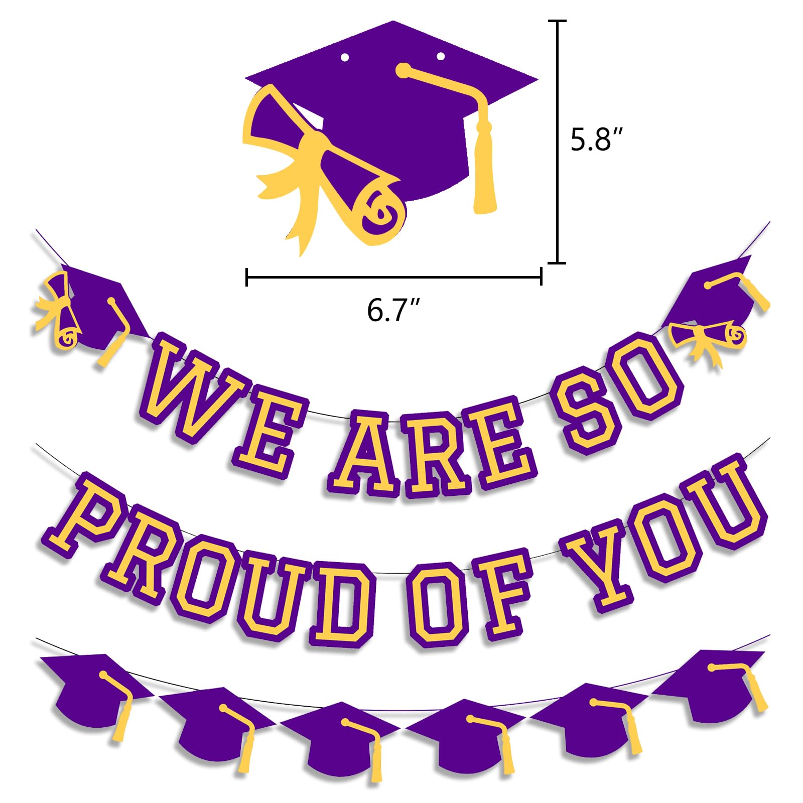 Includes 1 purple and yellow we are so proud of you banner, 1 purple and yellow graduation cap garlands