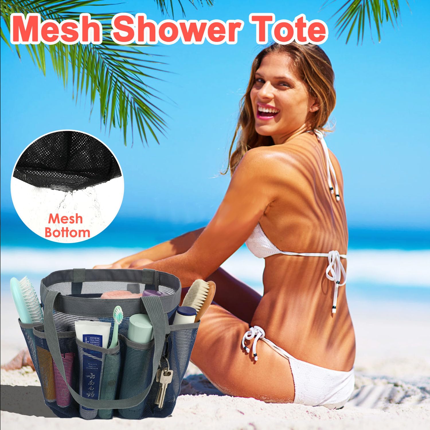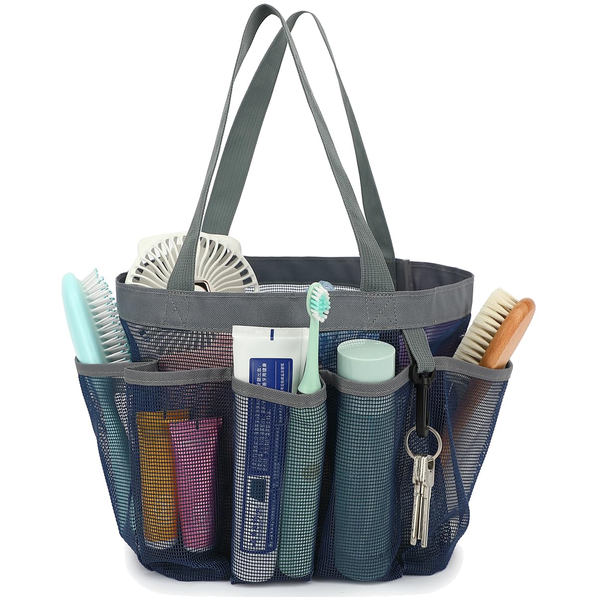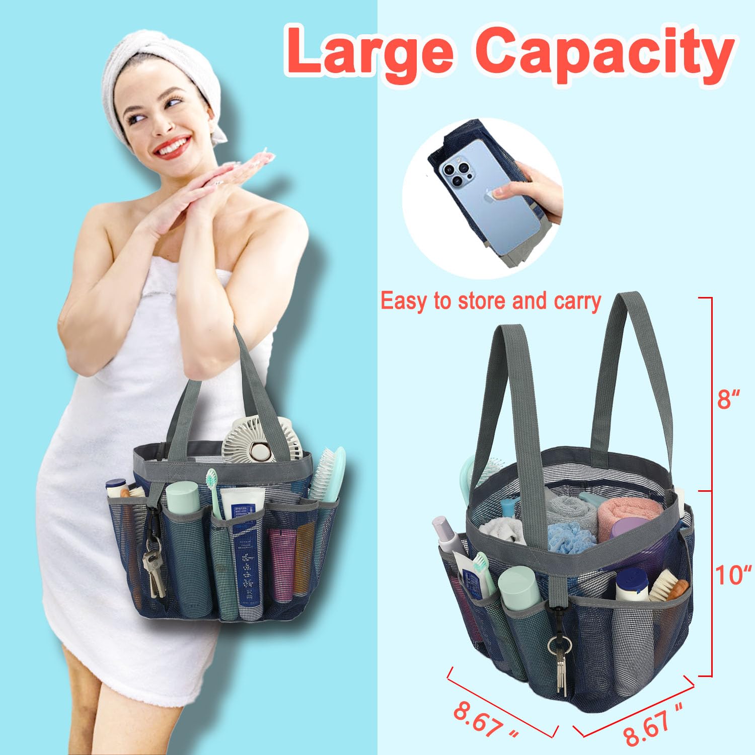 ๐ฟใ๐๐๐ซ๐ ๐ ๐๐๐ฉ๐๐๐ข๐ญ๐ฒ ๐ฐ๐ข๐ญ๐ก ๐ ๐๐จ๐๐ค๐๐ญ๐ฌใWith dimensions of 8.67*8.67*10 inches (L*W*H), the mesh shower tote bag with a keychain for college guys offers ample space for toiletries and bath essentials. 7 side pockets are perfect for smaller items like suncream, face cleanser, toothbrush, shaver, comb. while the main compartment accommodates larger items such as shampoo, body wash, towel, clothes, hairdryer, soap. The open mesh design also makes it easy to organize and locate items within mesh shower caddy dorm.