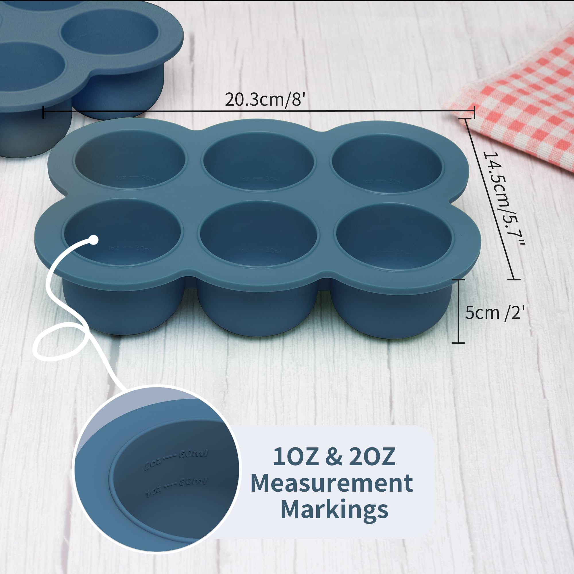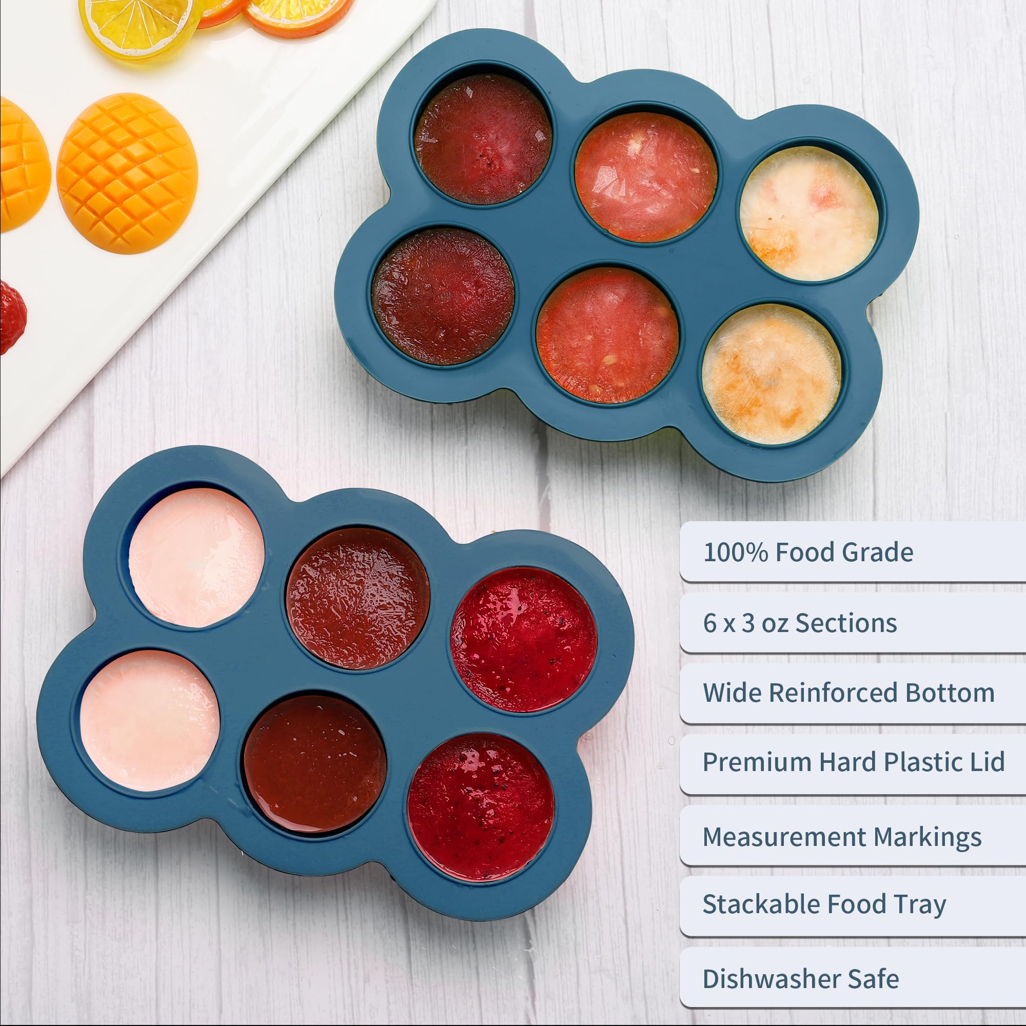【3oz x 6 SECTIONS BABY FOOD FREEZER TRAY】 Each 3 oz section has 1 oz and 2 oz measurement markings. Prepare, apportion and freeze exact food portions for your baby in advance. And you can increase the serving size as your child’s appetite grows