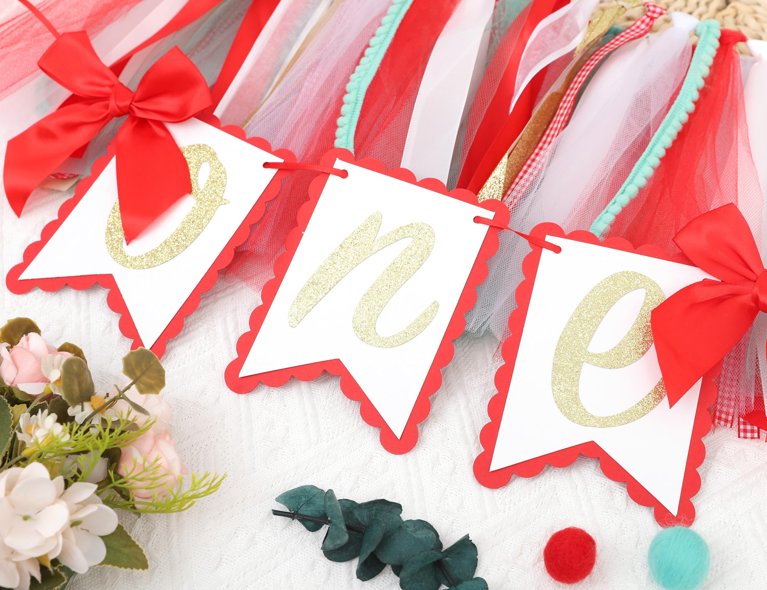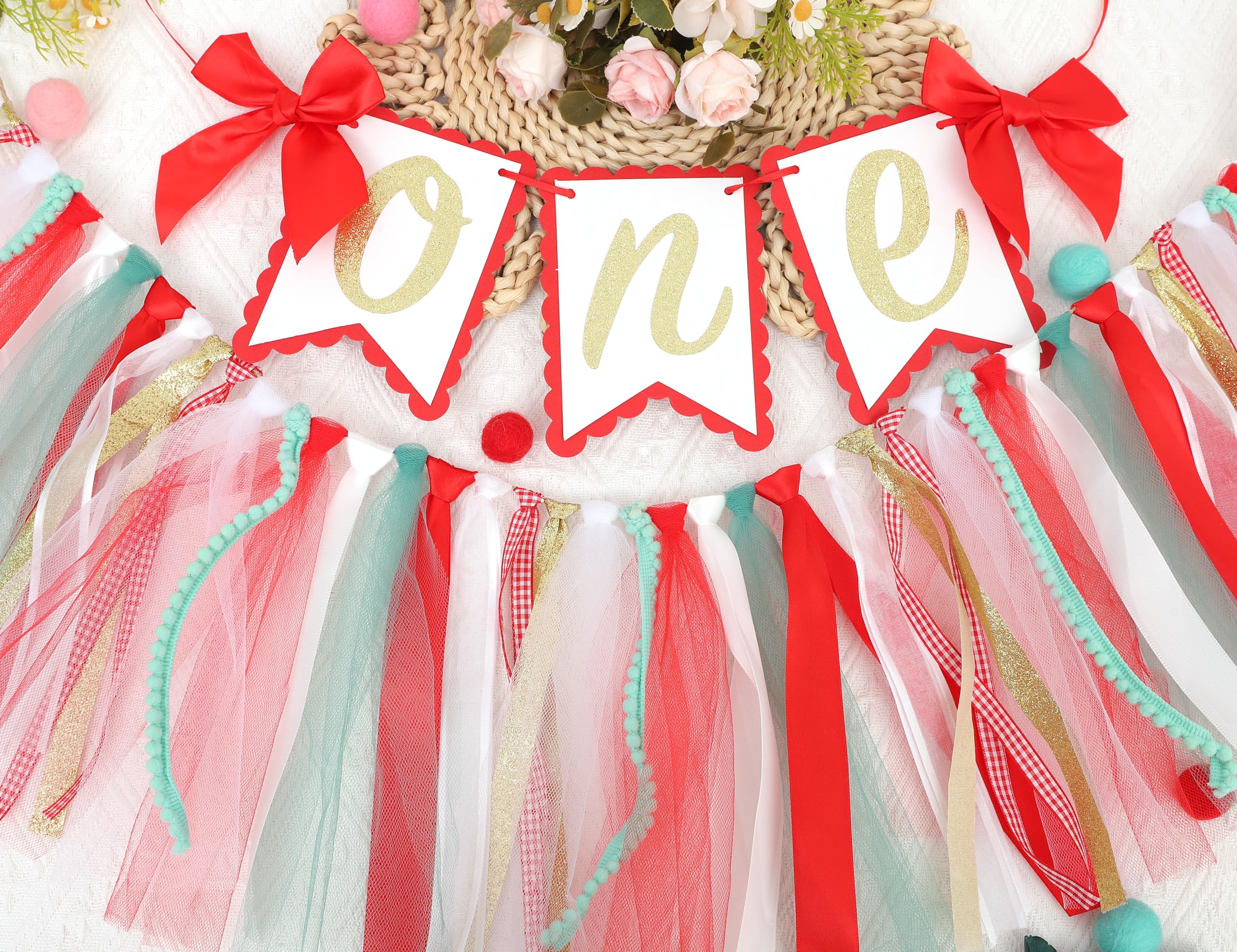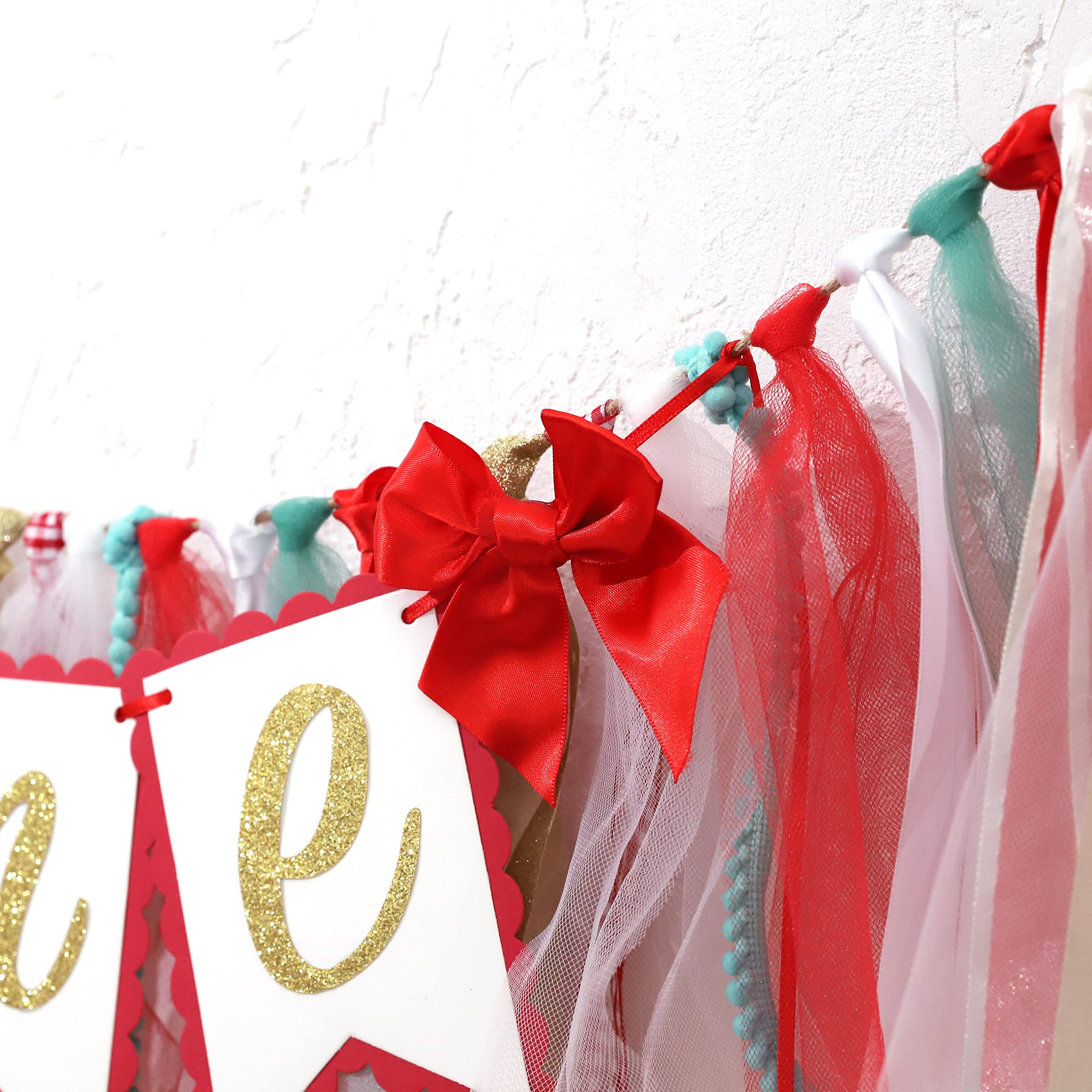 SPECIAL DESIGN AND SUTIABLE SIZE - This Christmas birthday banner is made up of red and green ribbons, tulle and card stock with gold glitter letter one on it which is full of Christmas atmosphere . The banner measures 8.27" tall and 80” long which is suitable for most highchair.
