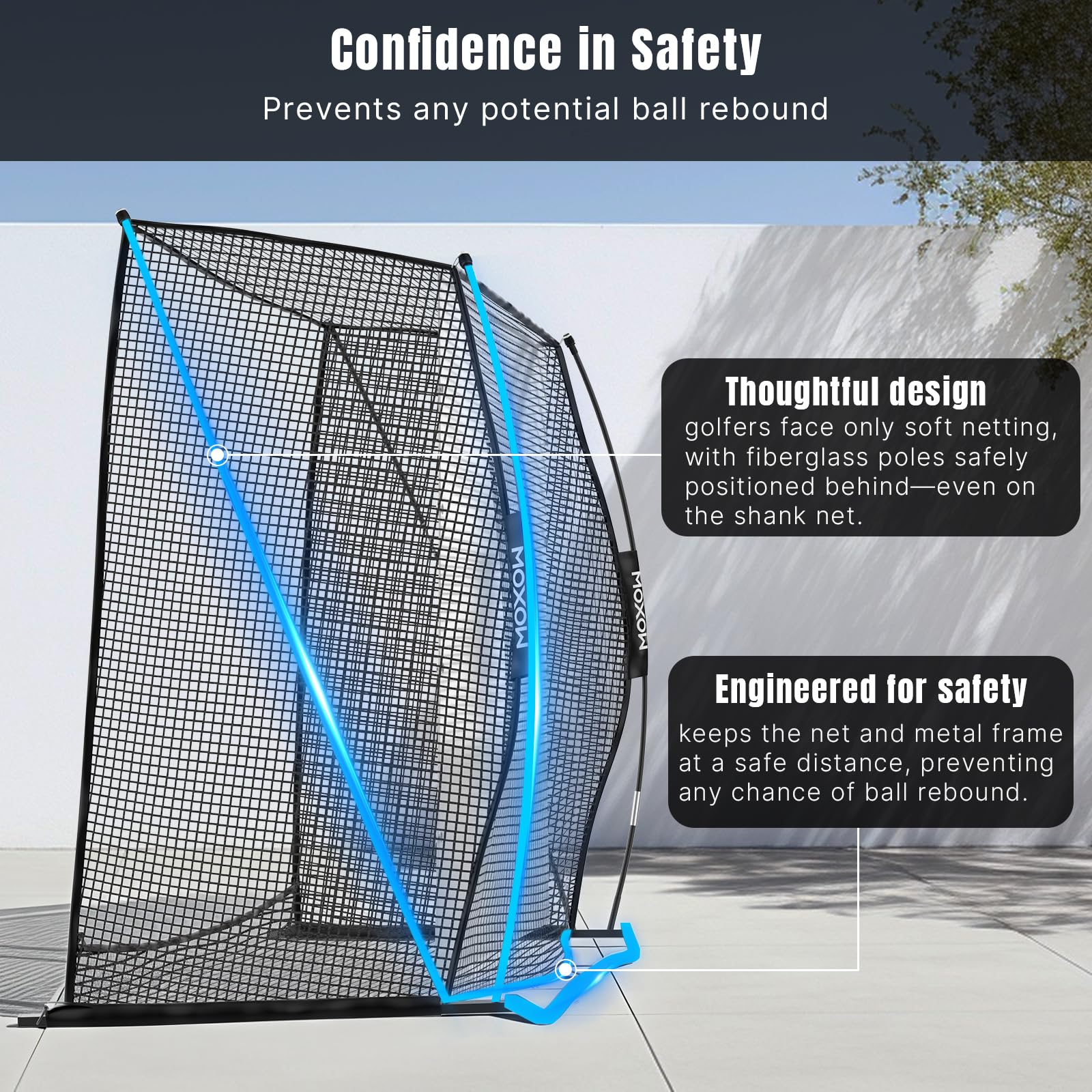 Reducing Bounce-Back Safety Design: Hidden fiberglass poles and a rear safety buffer prevent balls from hitting the frame - reducing bounce-back and improving safety compared to standard golf practice nets.