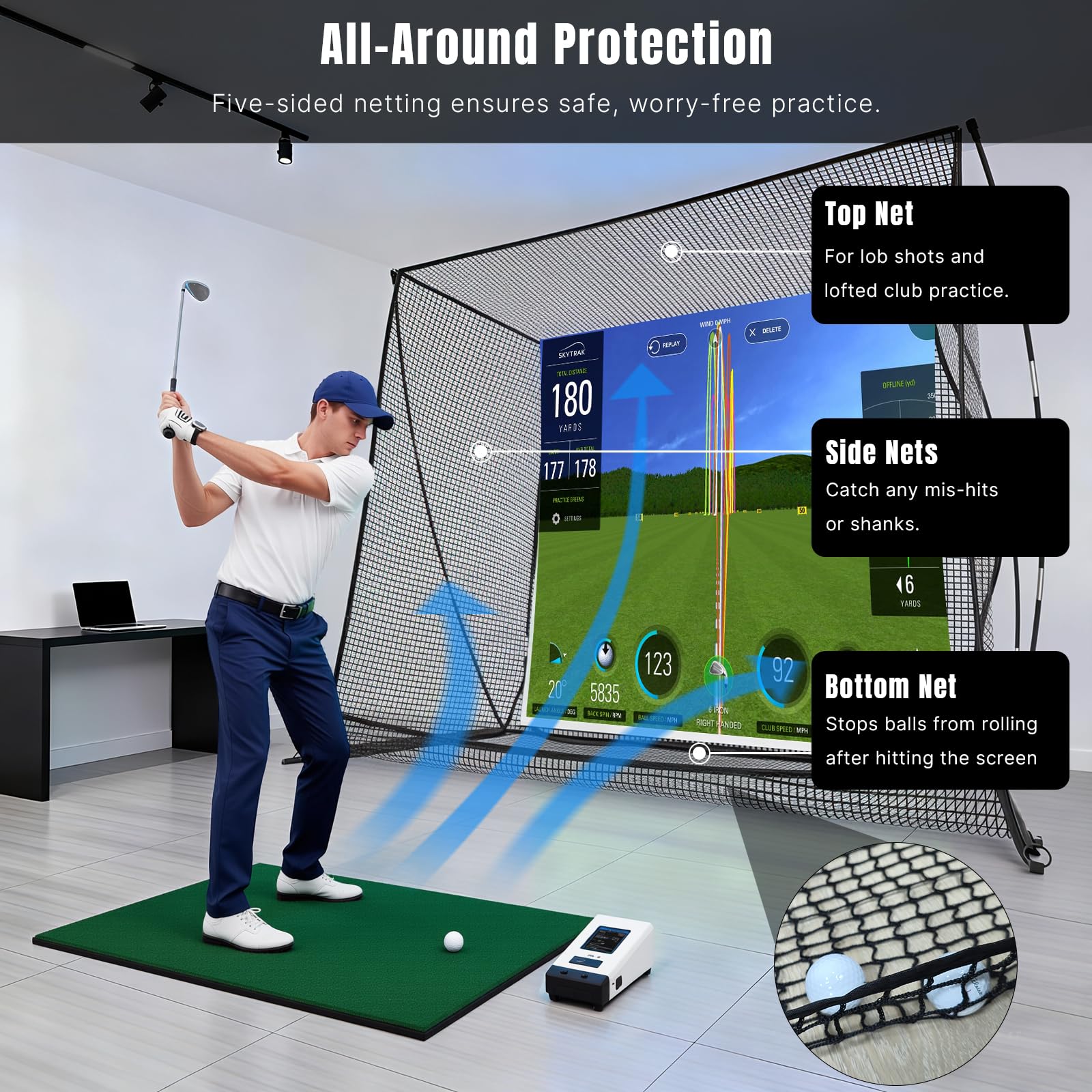 Premium 7-Ply Net Built to Last: Constructed with durable 7-strand impact netting engineered to withstand full-speed driver shots. Built for long-term durability in both indoor and outdoor environments.