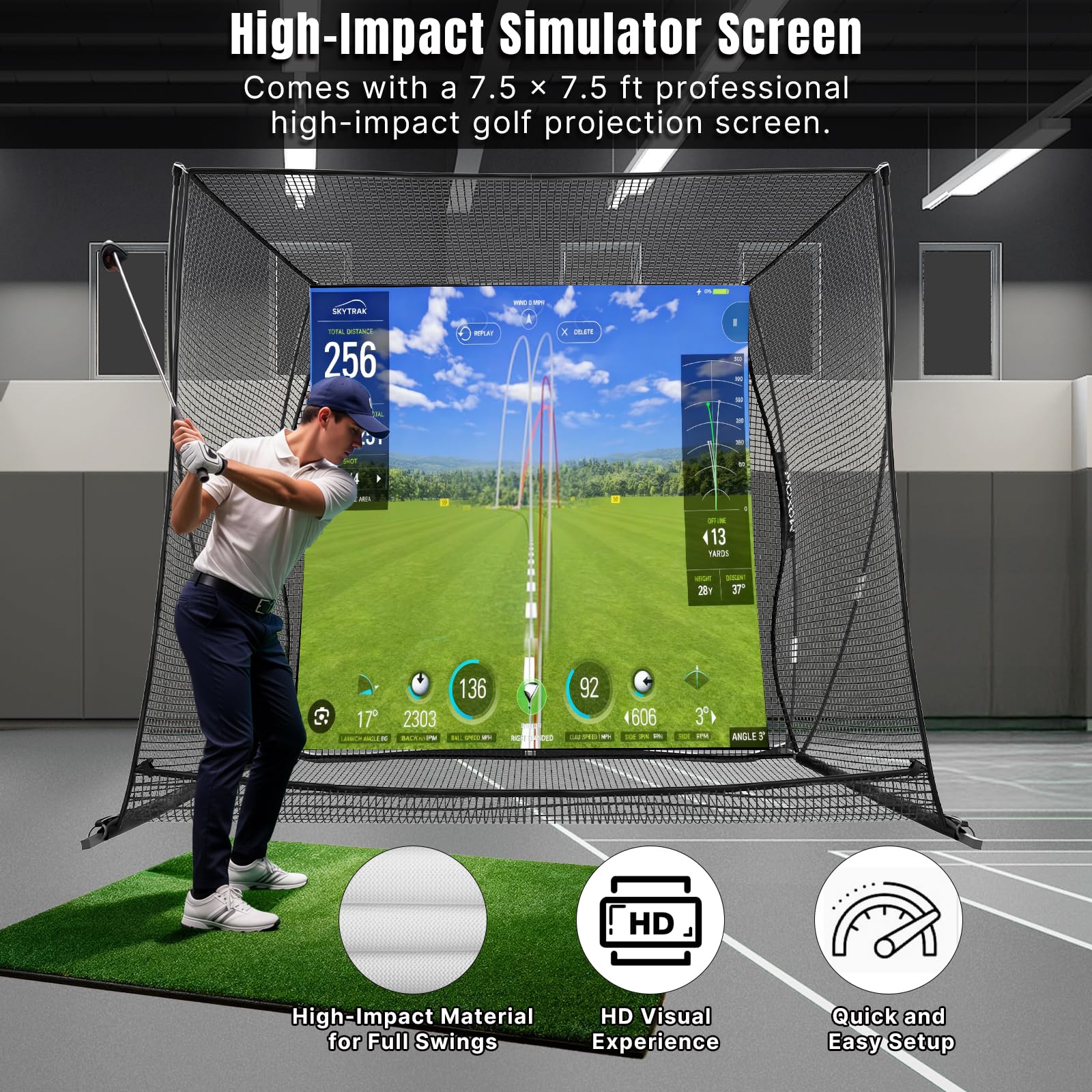 Simulator-Ready HD Impact Screen: Features a high-impact, projection-ready screen that delivers clear visuals and true ball-flight feedback in simulator mode. Easily switch between screen hitting and standard practice net sessions.
