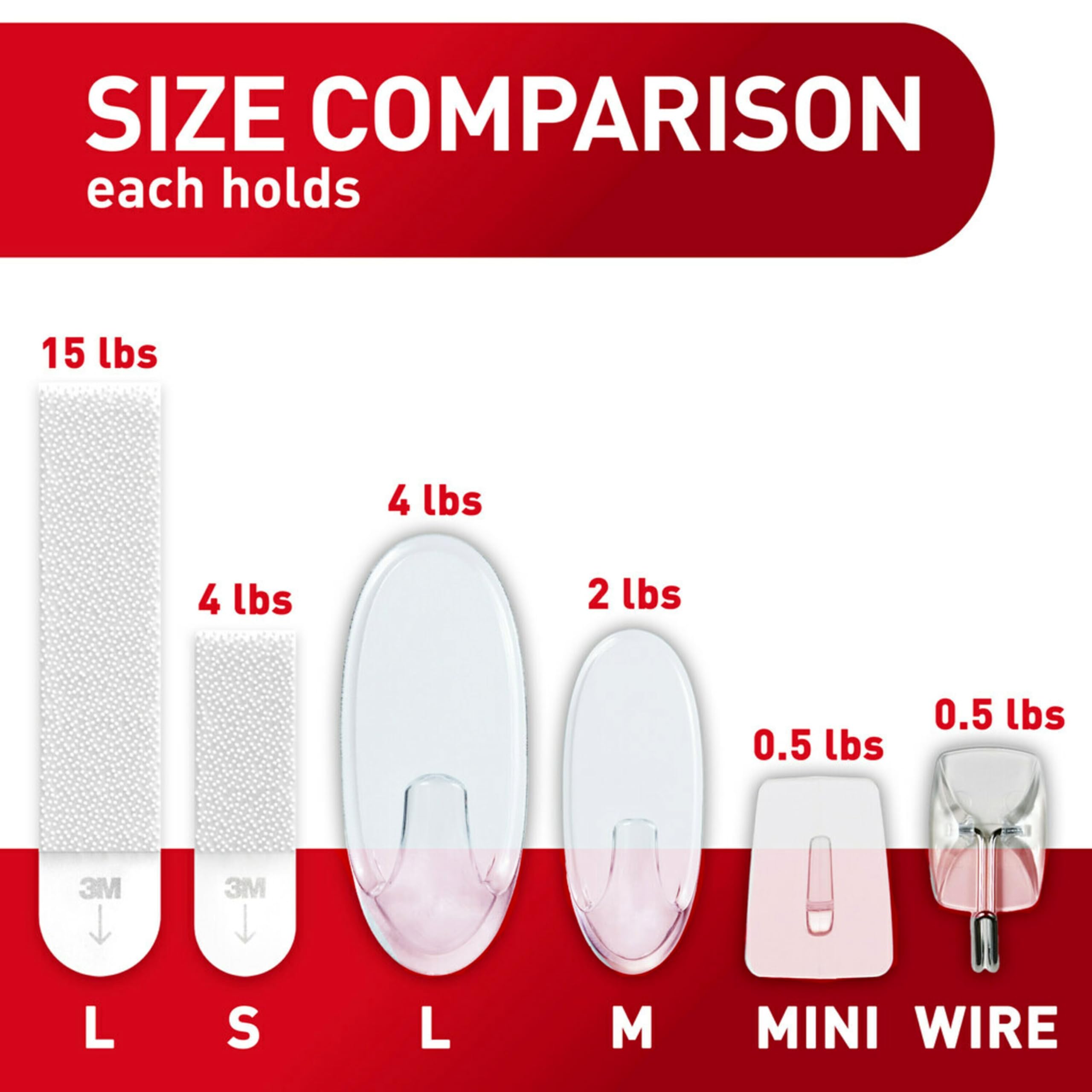 INCLUDES - 4 small Picture Hanging Strips, 4 large Picture Hanging Strips, 3 clear medium hooks, 1 clear large hook, 7 clear micro hooks, 4 clear small wire hooks, 22 clear strips; Hangs up to 15 items and reclosable case is great for storage and is easy to refill