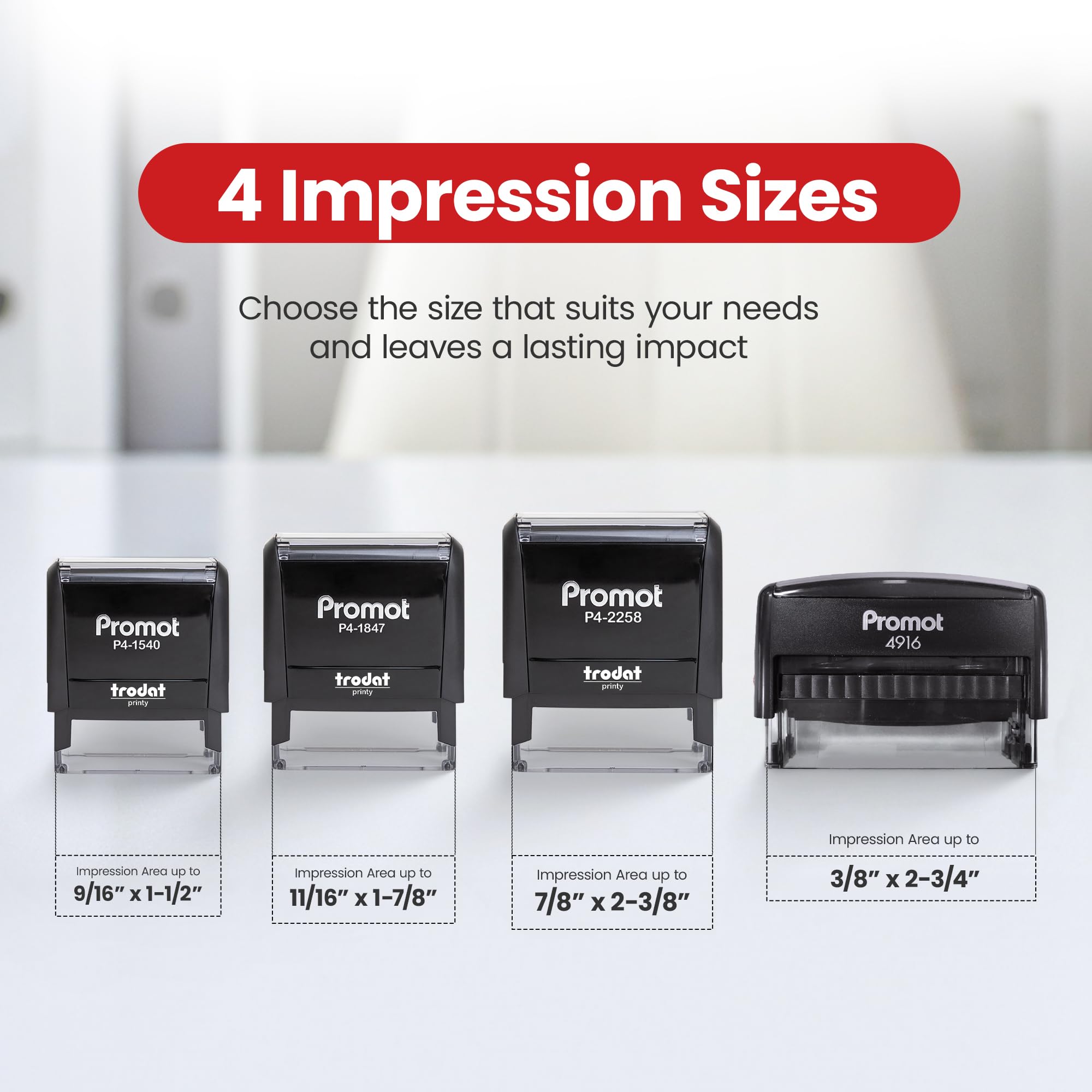 4 Size Options for Any Use Select from small, medium, large, or long sizes to suit any task—from personal labels to wedding invites. Clear, stylish impressions for all your stamping needs. These sizes include a small 9/16"" x 1-1/2"", a medium 11/16"" x 1-7/8"", a large 7/8"" x2-5/16, and a long 3/8"" x 2-3/4""