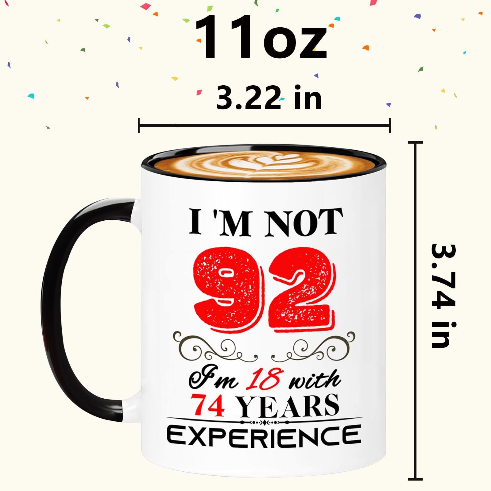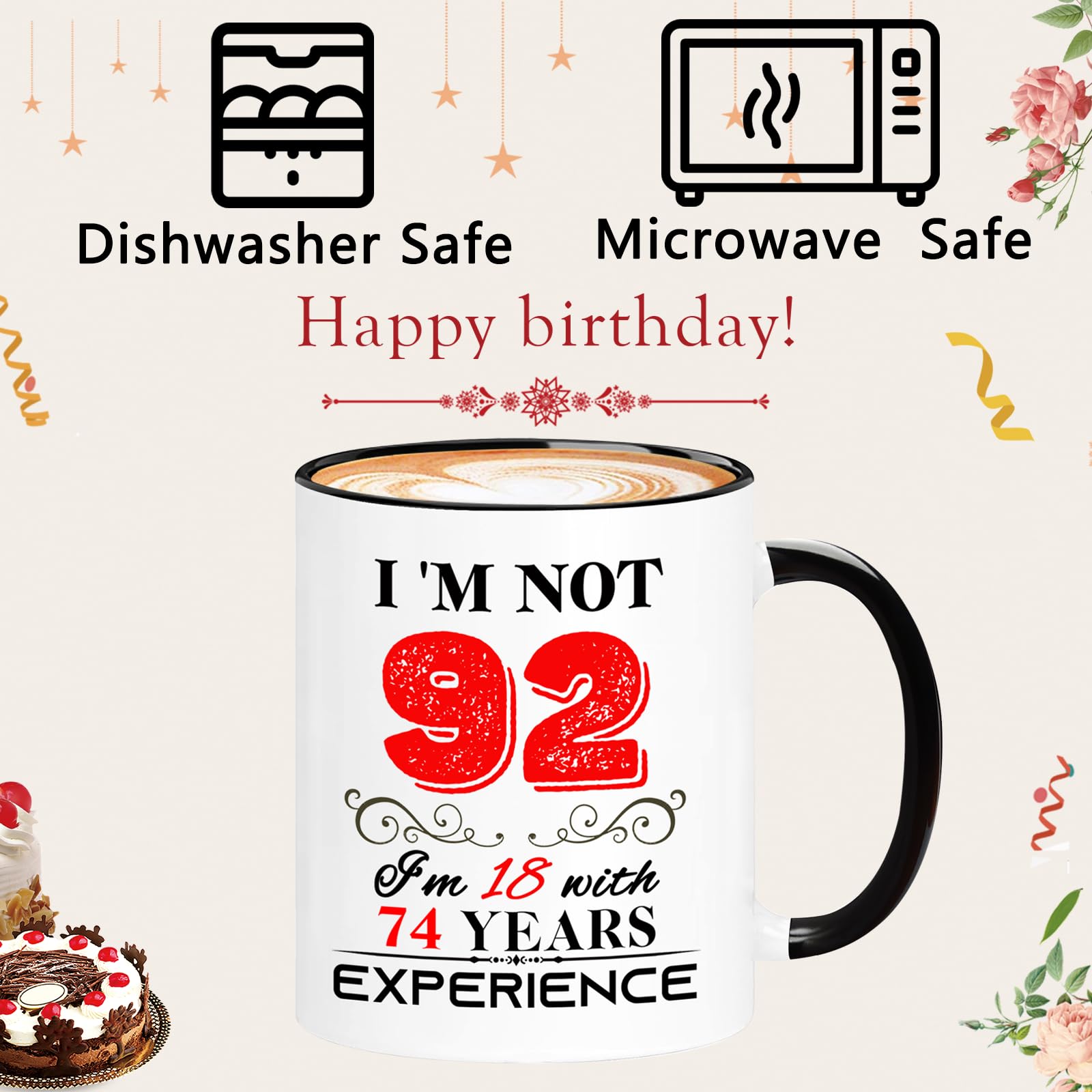 【Birthday Gift】: This funny "I'm not 92, I'm 18 with 74 years experience" Mug is the perfect birthday gift for a 92 year women men! Give it to your mom, dad, papa, mama, grandma, grandpa, brother, sister, husband, wife, aunt, uncle, cousin, son, daughter, boyfriend, girlfriend, boss, coworkers, bestie, granddaughter, or your best friend for her he birthday.
