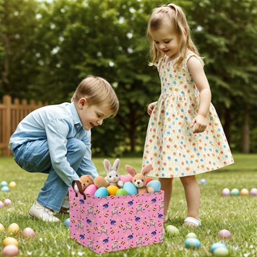 【LARGE CAPACITY AND FASHIONABLE PATTERNS】: The children's Easter basket has a large capacity and can accommodate larger Easter gifts and items. The Easter gift basket is digitally printed with patterns featuring Easter eggs and rabbits as the theme, with bright colors that will not fade.
