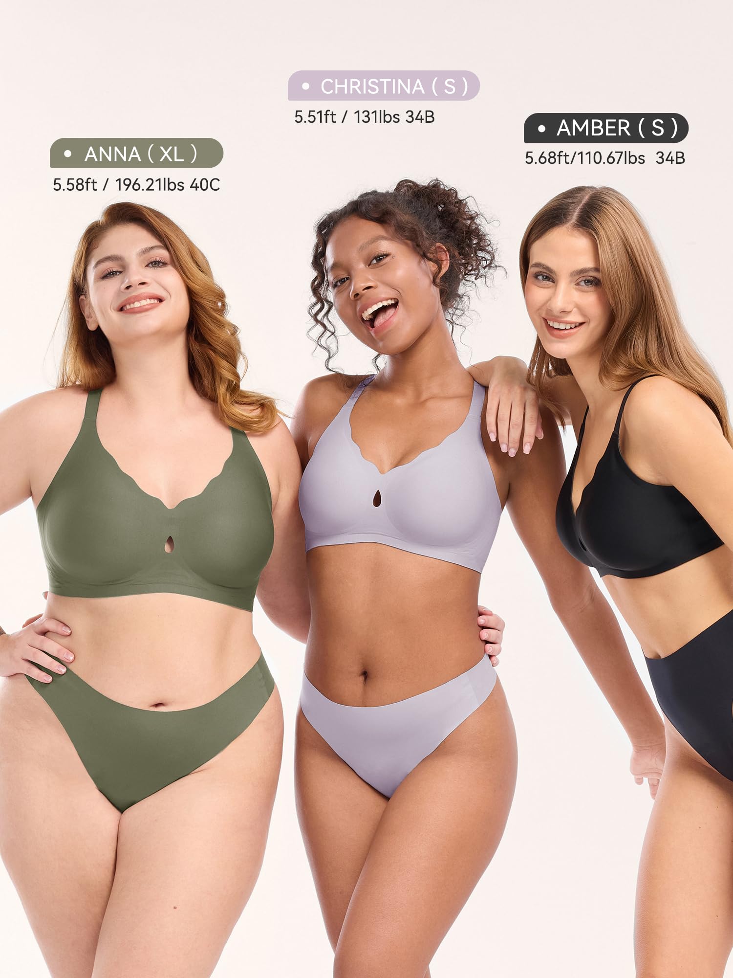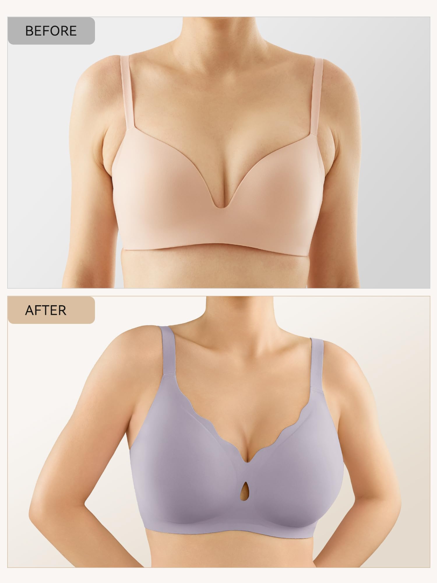 ELEGANT WAVE AND DROP DESIGNοΌ LUCKMEEY seamless bras feature a delicate wavy edge design that enhances natural curves and gives you a smooth, rounded silhouette. The scalloped bra edges contour gently to your bust, creating a flattering shape. The low-cut V-neckline with a water-drop design adds a feminine touch and highlights your bust. This women's everyday t-shirt bra for women is lightweight, invisible, and non-see-through, giving you a smooth look under your clothes.
