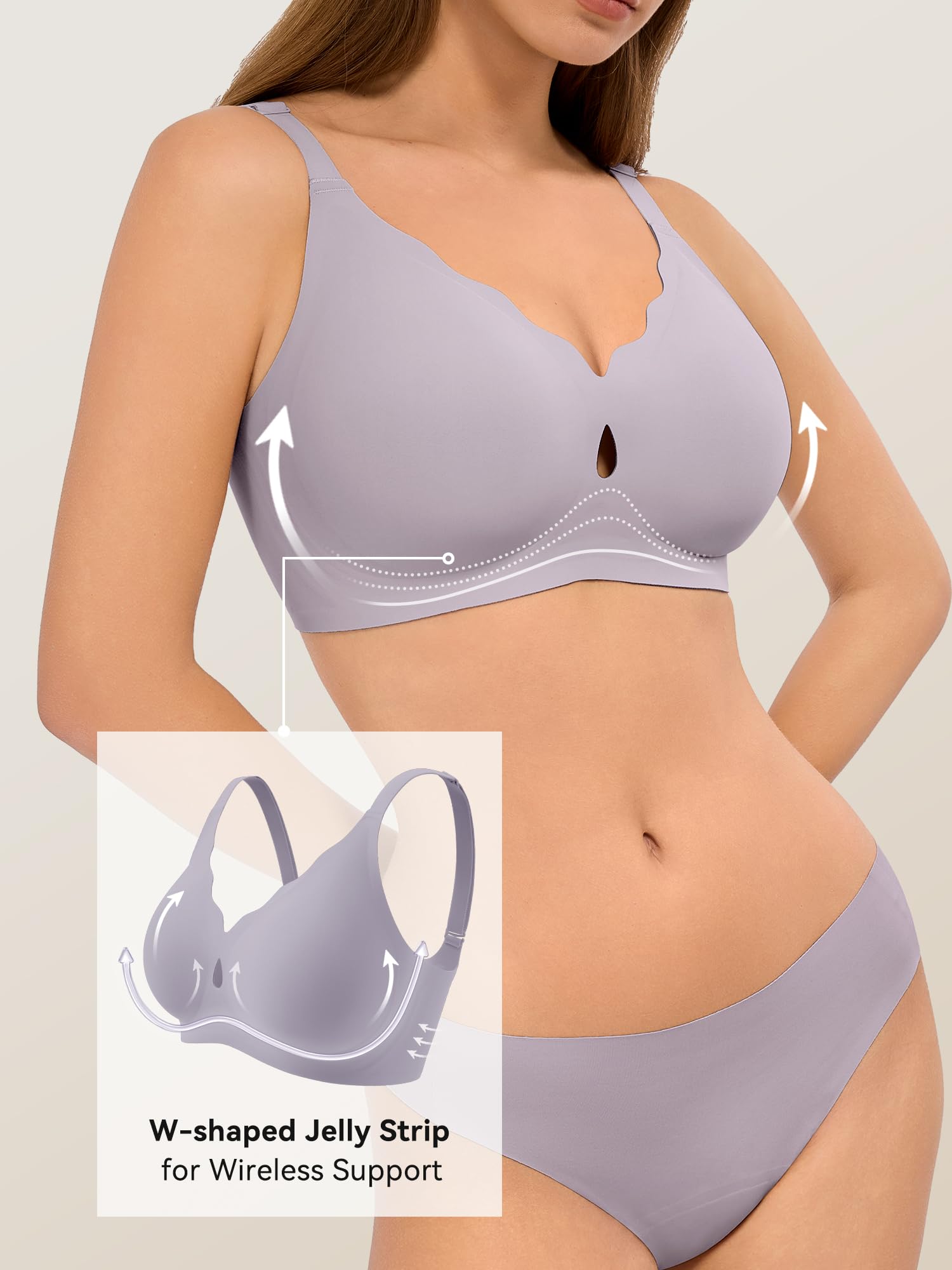 "W" JELLY STRIPE WIRELESS BRA: Women's full coverage bras with no underwire designed with "Wβ shaped βjelly stripsβ to support and lift the bust 360Β°. Our everyday bras with support are paired with semi-fixed padding to fit a variety of bust shapes seamlessly. The breast pads create a naturally rounded, fuller shape for younger women and provide ultimate comfort and support for older women. CARE INSTRUCTIONS: HAND WASH OR MACHINE WASH IN A LAUNDRY BAG.
