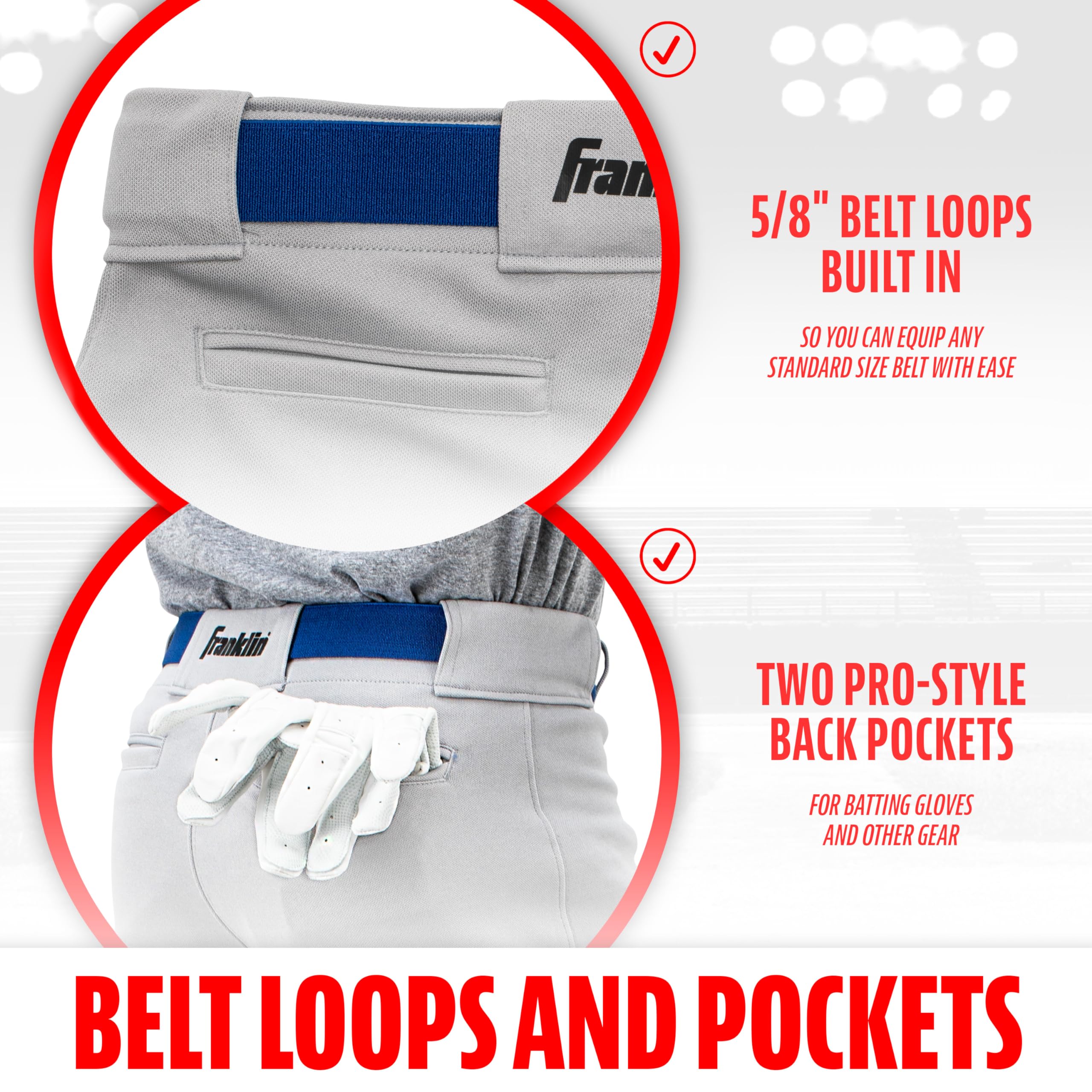 BELT LOOPS AND POCKETS: These pants come with 5/8" belt loops to fit any standard size baseball belt and two pro-style back pockets for batting gloves and other gear